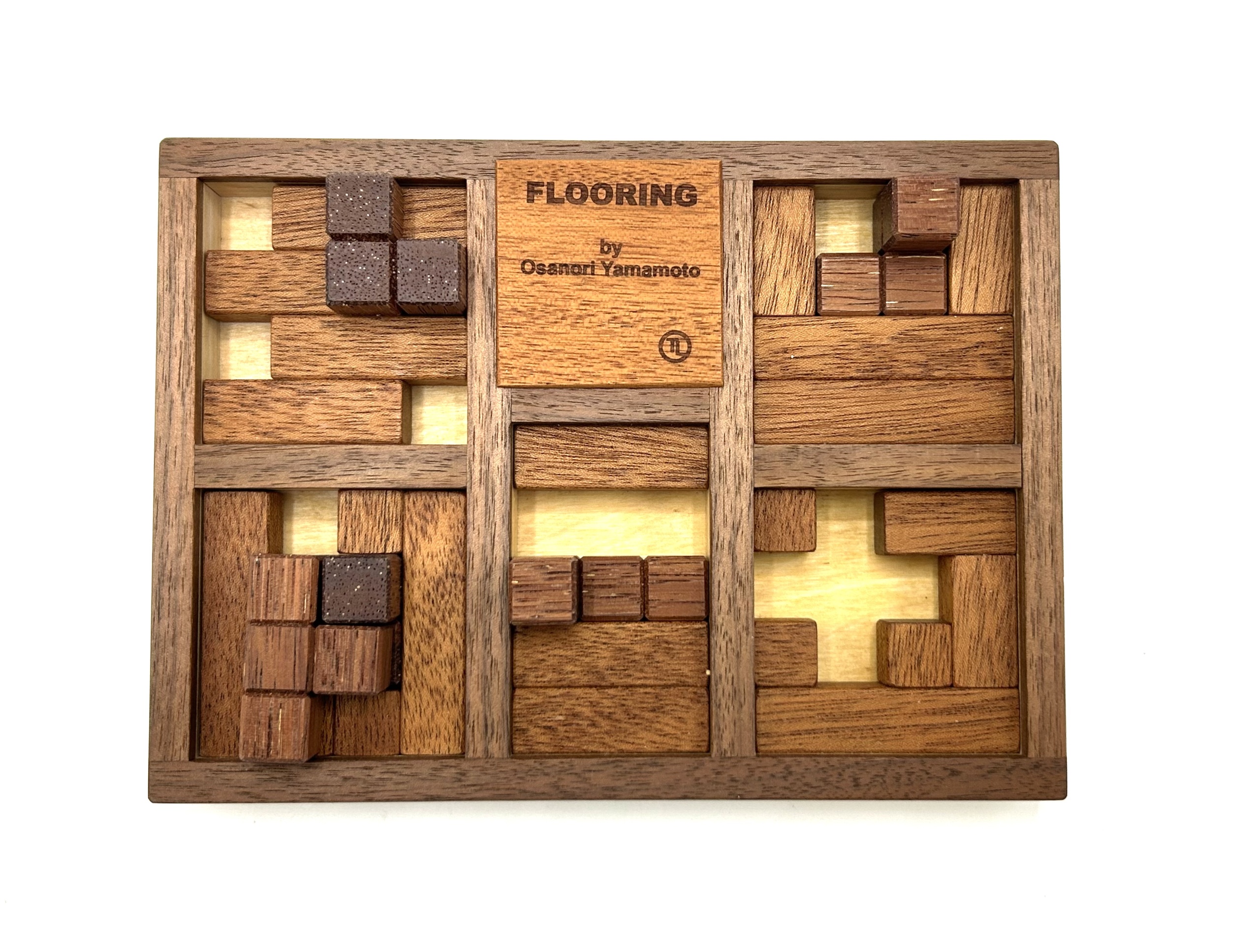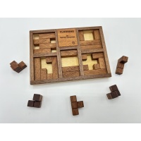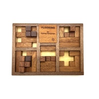 This is a lovely 5-level packing puzzle, designed by Osanori Yamamoto and manufactured by Tom Lensch. Each square on the floor is a level, into which you must pack the five tetramino pieces. A beautiful puzzle rarely up for sale!