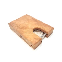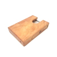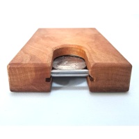 I think this is made from Cherry and it has hidden tools and multiple steps to solve in order to remove the Kennedy Half Dollar coin.
