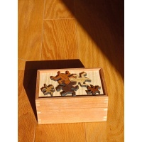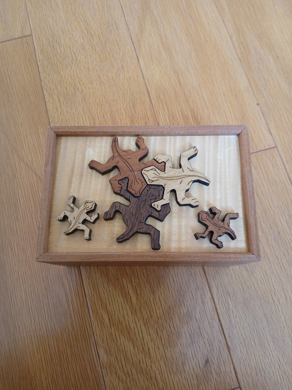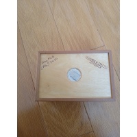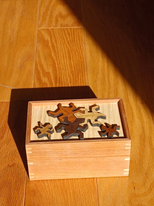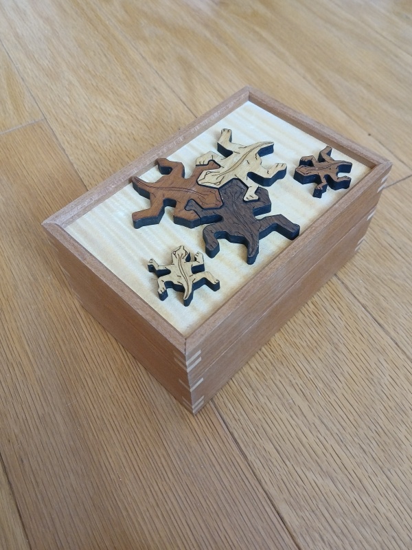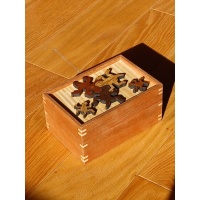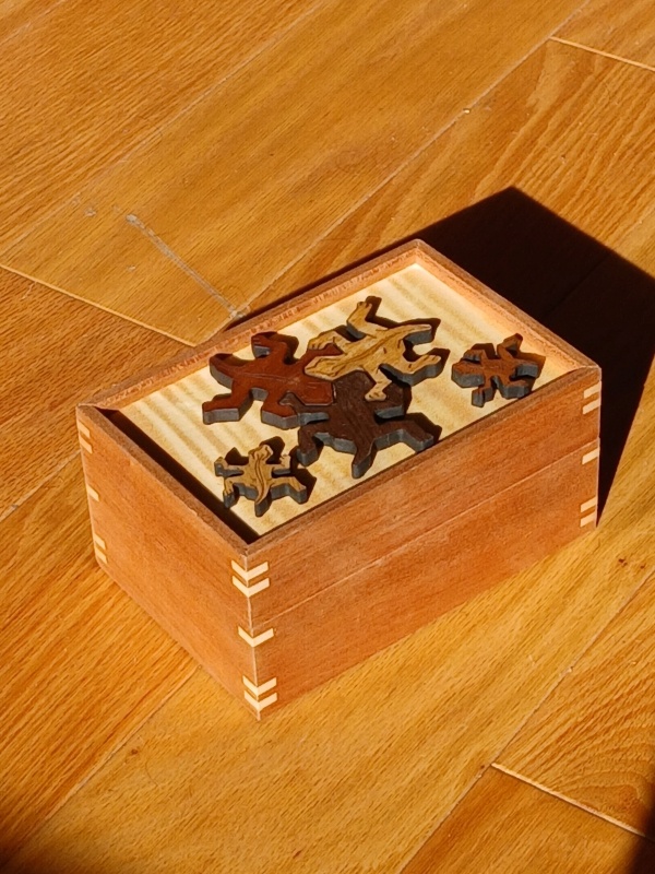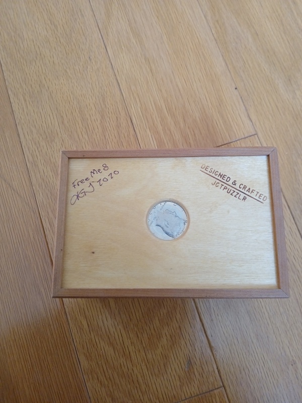 At this point, he's made 9 different coin release puzzles, and this one may be his best of the lot. It dramatically stands out by being a large puzzle box that solvers have to open with tools they find while poking at the box. It's much larger and more complex compared to his other coin releases which are far smaller and more compact. 1-7 and 9 may fit nicely into a pocket, but not this one! It also looks amazing with some gorgeous chatoyance as the wood shimmers and shines on the top of it. I was foolishly worried when I first got this puzzle thinking it was a sign of damage. I had never known that wood could ripple like a gem before!