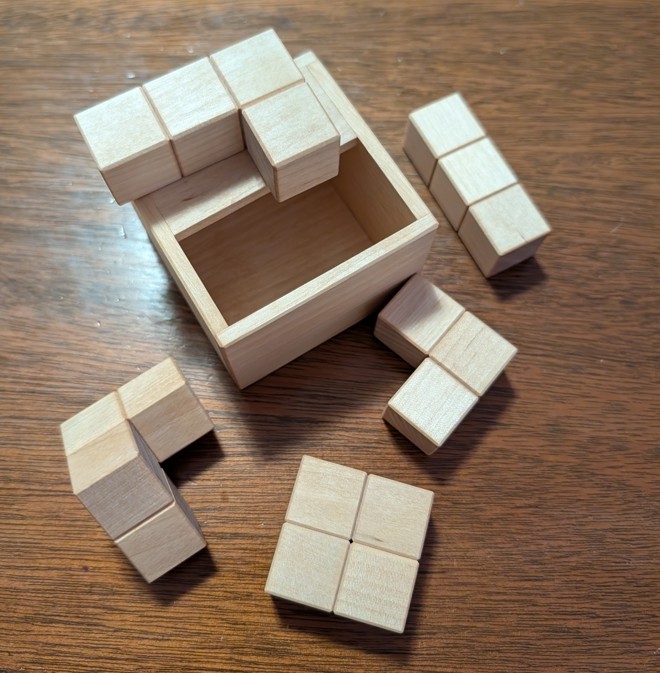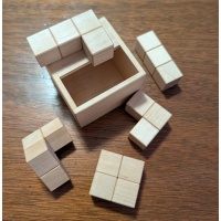 The objective is to reassemble the pieces into a compact rectangular block within the box, using a precise sequence of movements to navigate the restricted opening. Although the puzzle contains only five pieces, the challenge lies in discovering the correct order and rotations rather than simple packing.