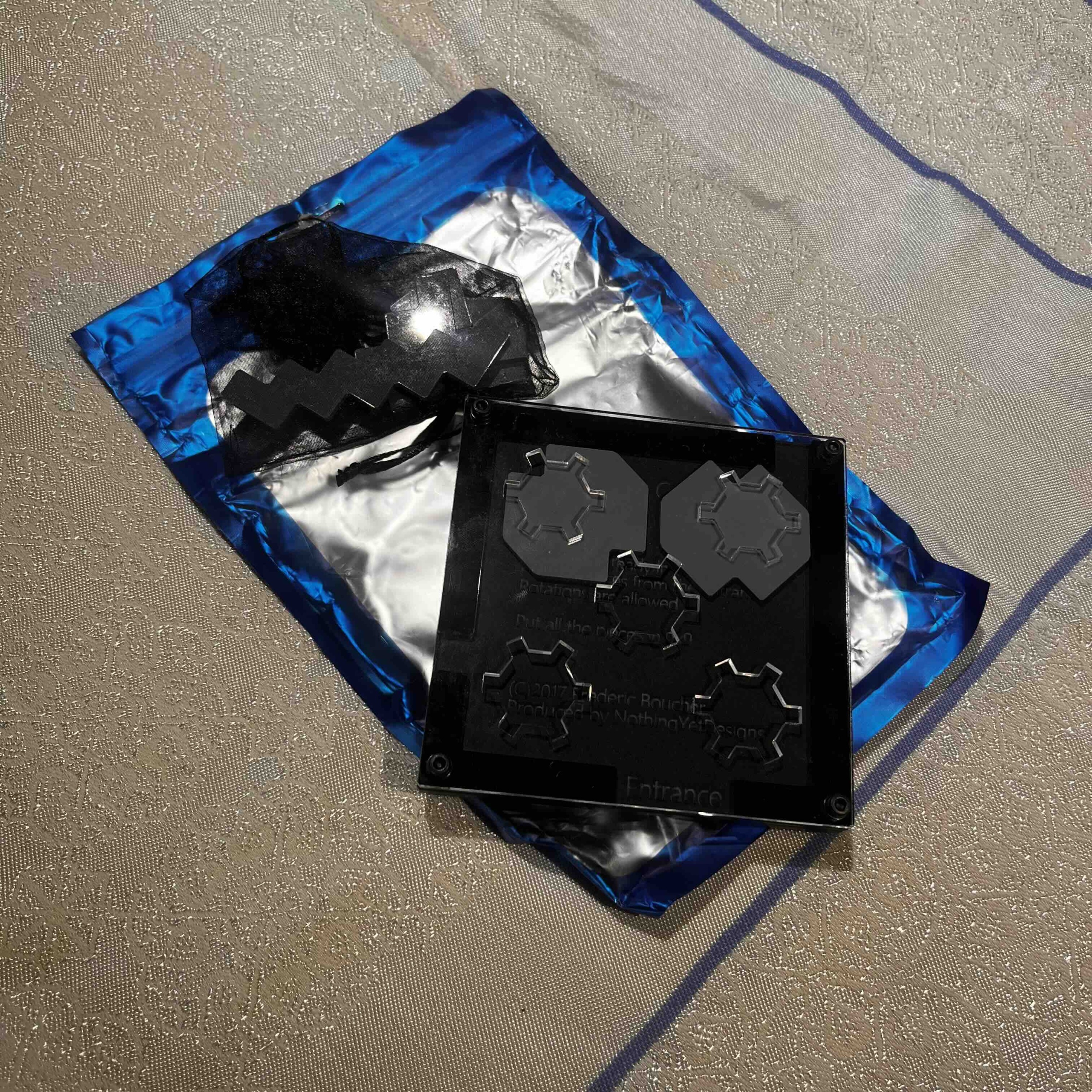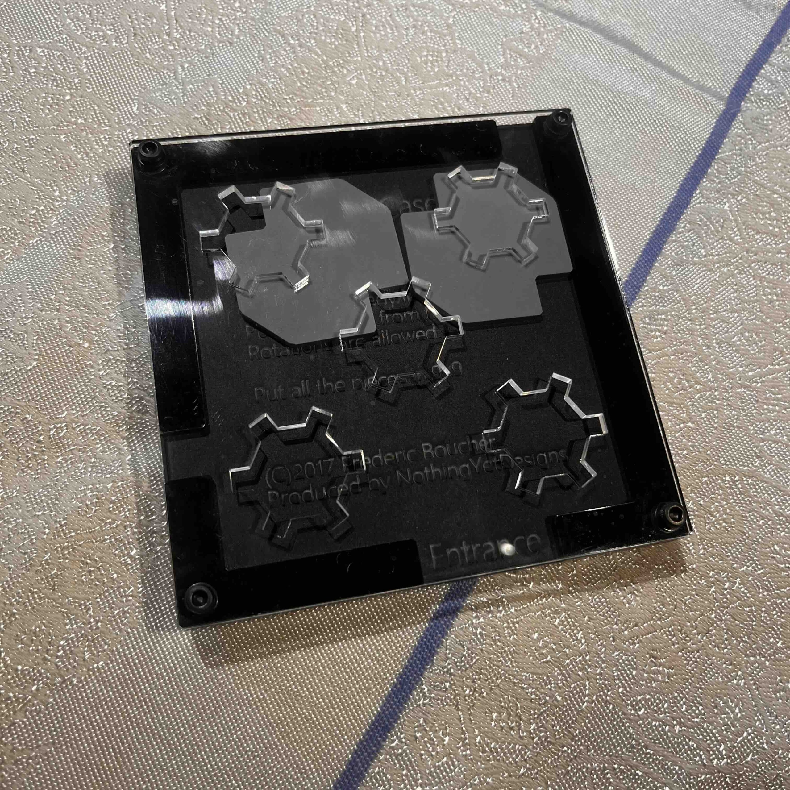 Gear Case is a 2d packing puzzle designed by Frederic Boucher and produced by NothingYetDesigns. It's constructed from acrylic and metal parts. The goal is to pack in all the pieces from the drawstring bag. However there are two pieces already in the frame and they can't be removed. This is a wonderful puzzle that is not seen often.