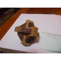 This geometric kumiki-style puzzle appears in the Chicago Puzzle & Novelty catalog, No. 3091. On the inside of the puzzle, one of the pieces is marked "KERR." in neat block letters, maybe stamped. I believe this puzzle is from the 1920's-30's.