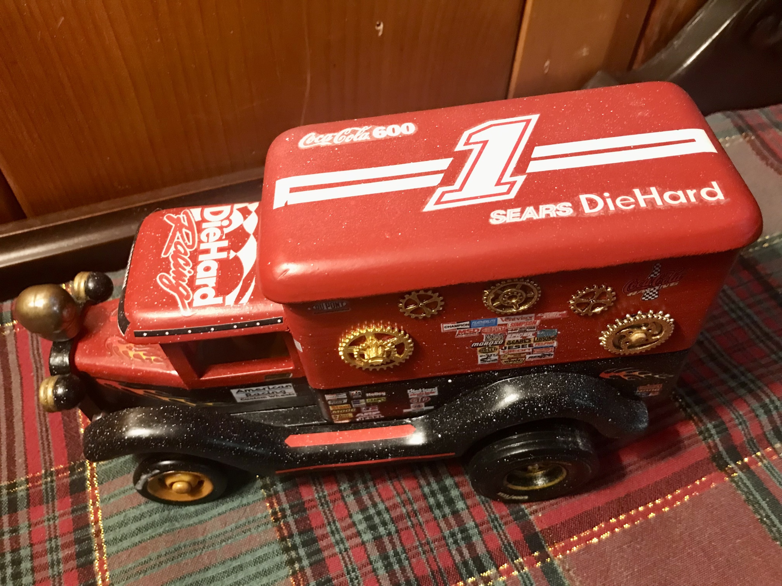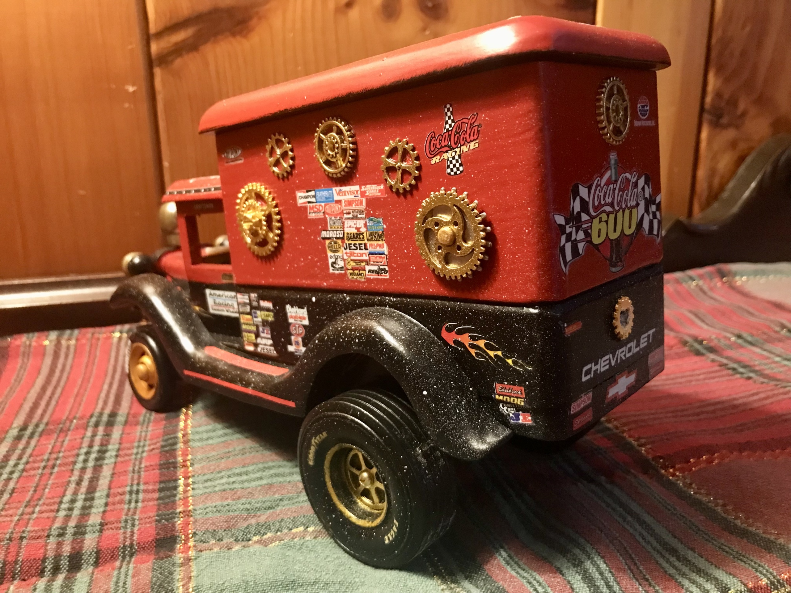 And beneath the truck hides a wind-up spring salvaged from an old clock, waiting patiently for its moment in the solution. The headlights have been painted in glow-in-the-dark paint, another nod to the “high-tech wonder” of childhood nights when glowing toys meant the play didn’t have to end. Ghost Mail is a tribute to handmade toys, to imagination, to Christmas magic, and to the joy of solving something crafted with heart, history, and just a touch of mischief.