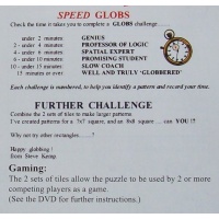 Select one of the twenty GLOBS challenges, each of which fits a 6x6 square. Using either set of tiles, try to duplicate the chosen pattern. All 12 tiles must be used.