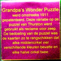 The puzzle was patented in 1911, This variation on Thurston's puzzle was used as an advertisement for soap. The idea was to arrange the cards so that each center circle contained four different colors and each half circle contained two.