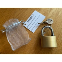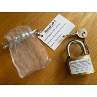 JL Puzzles notes: "The Haleslock 4 is a typical looking brass padlock with a steel shackle of a normal size. Upon external examination, nothing unusual could be can be detected, even if it is obvious that some modification must have been carried out to a normal lock to make it a puzzle or trick lock. Additional touches include Allard’s initials at the top of the lock body and Shane’s squiggly signature on the side (can’t be seen from the photos sorry). The Haleslock 4 comes with a key that has a “+” cross-section and with a chain attached. I have never seen such a key before but the key didn’t look very out of whack for a padlock key.  The “hole” for inserting the key is a “+” slot where the key should go in. Was the original lock like that or not?"