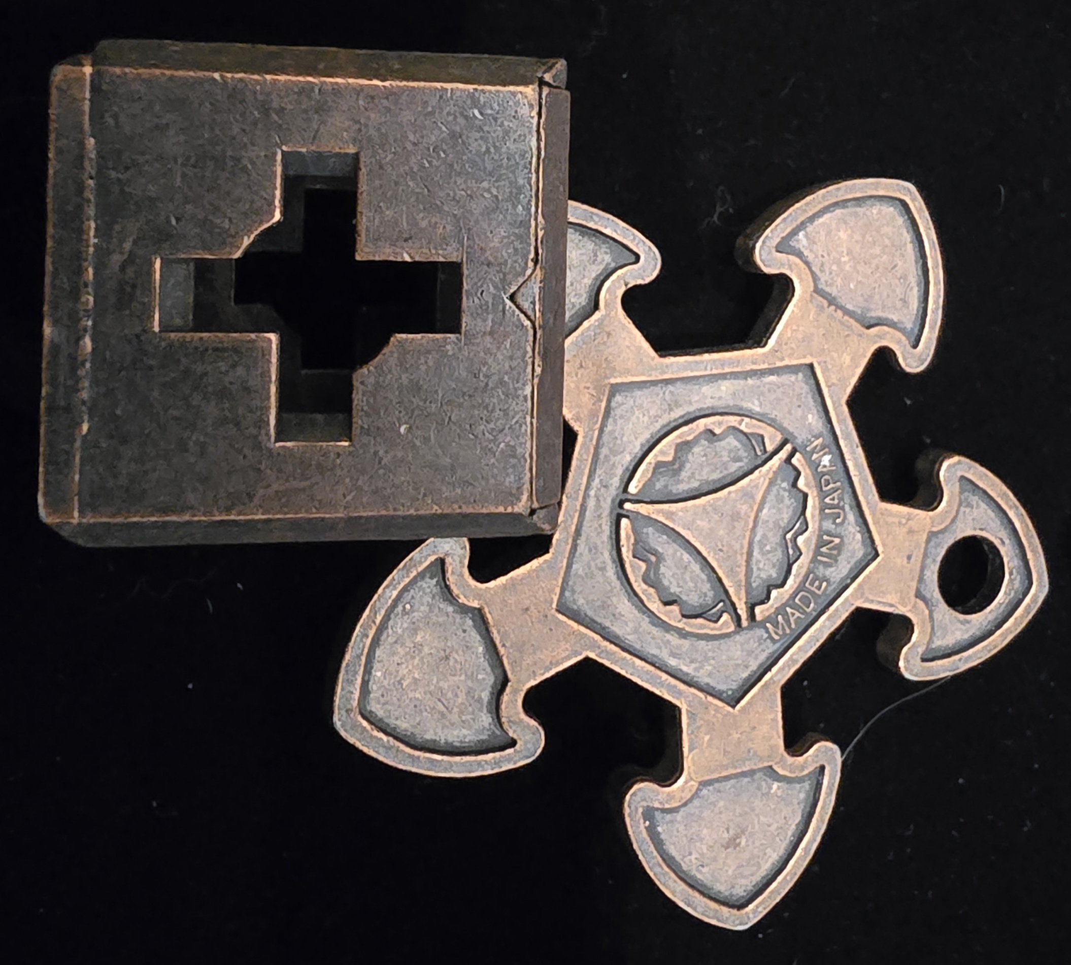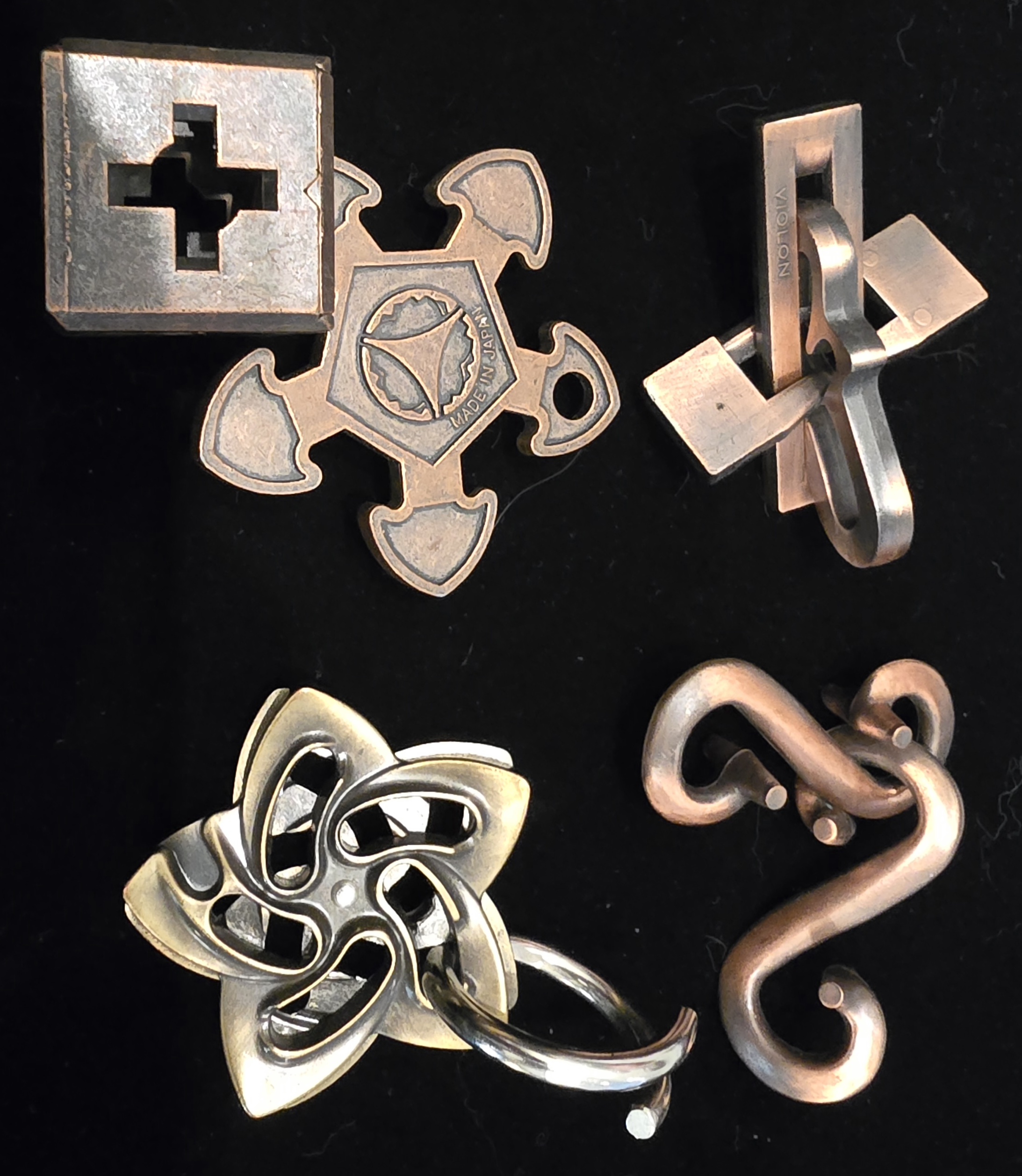 Up for auction is a premium set of four authentic Hanayama Cast Puzzles. These "disentanglement" puzzles are crafted from solid metal with a beautiful aged-patina finish. Each puzzle presents a unique mechanical challenge: you must find the exact sequence of movements to separate the pieces and—the true test—figure out how to reassemble them.