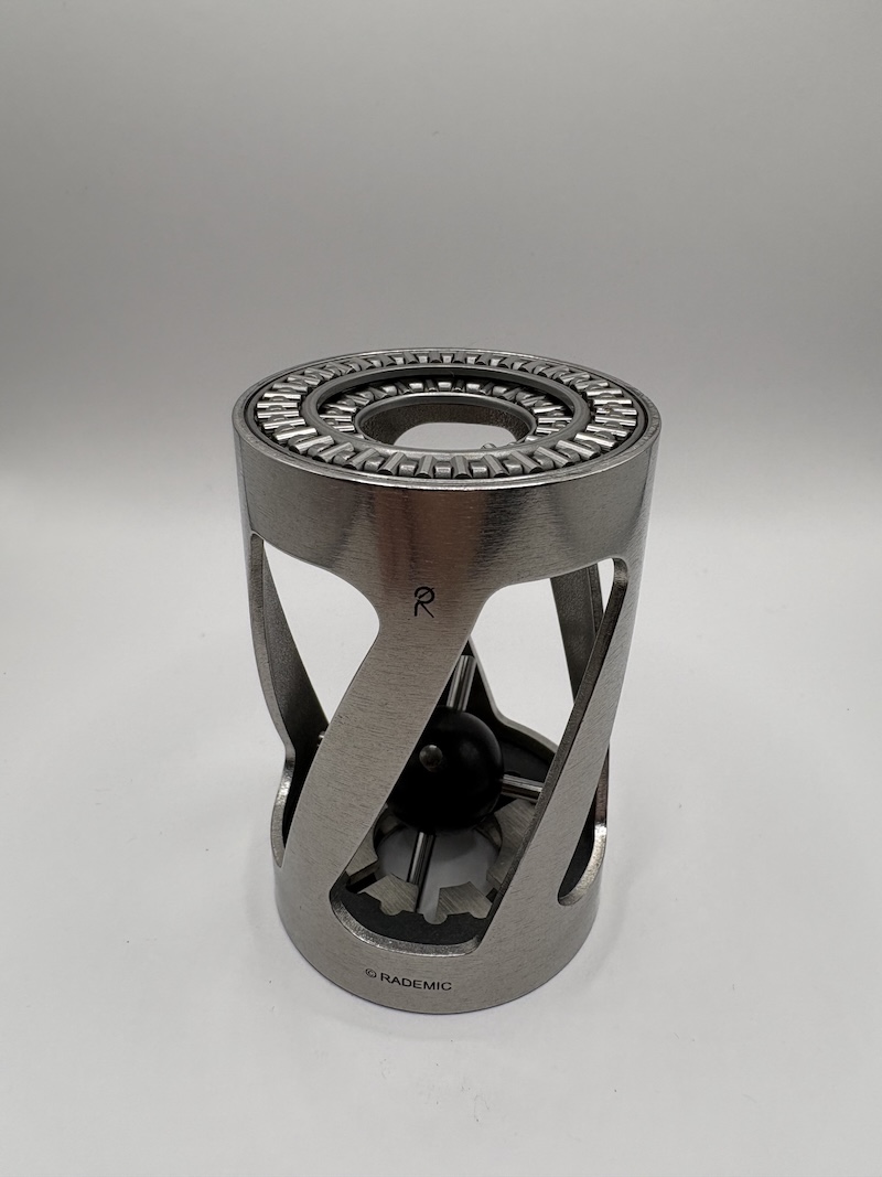 This puzzle was invented by Radek Micopulos in 2010.  It was inspired by a drawing on which a hedgehog climbs out like a spider throught a hole in the cage lid.  This stainless steel puzzle is made in a modern design with axial bearings and a black gear.  The Hedgehog has 6 different length spines and is rated with a difficulty level of 3 out of 5 by the manufacturer.