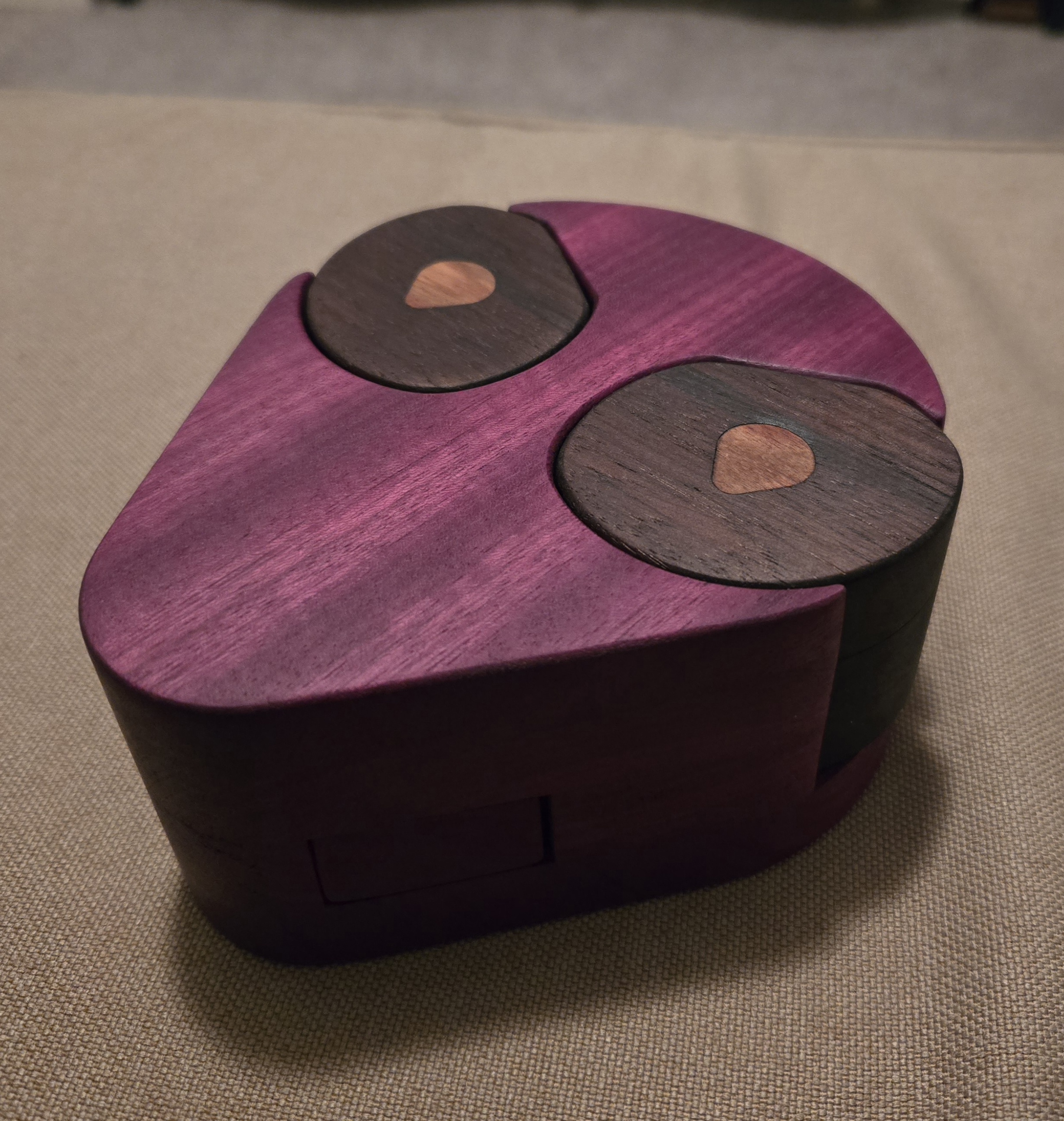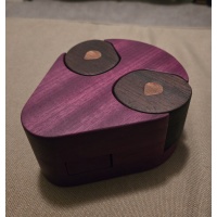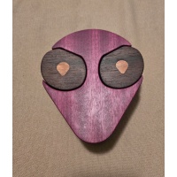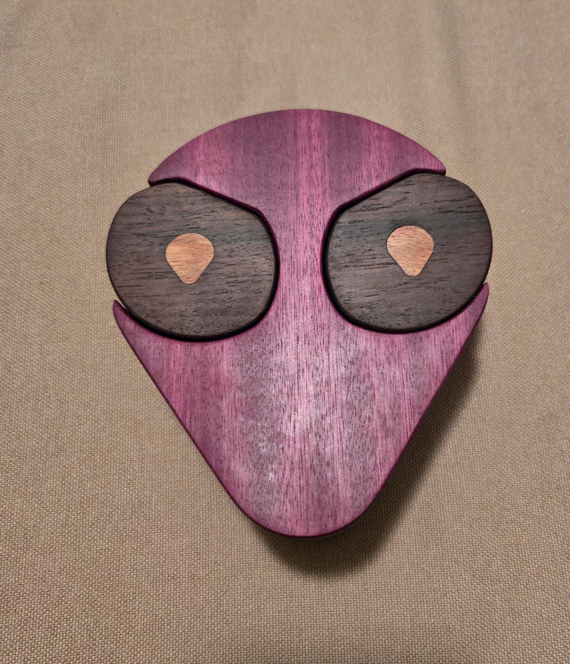 Hermie may not look like it but he has a kind soul and will abduct your heart. He is cute and loves to cuddle and wont even probe you (when you're awake). Hermie has 4 compartments, two drawers and two boxes. This item is not a puzzle. Made from purpleheart, Peruvian walnut and canarywood.