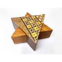 This is Hiroyuki Oka’s Secret Star puzzle box. This design was crafted when he was a member of the Karakuri group. He writes: It was created as an Xmas Present in 2005. It was designed as an image of Xmas The base is a triangle Secret Box. It became a Beautiful box with Yosegi. It was more difficult than standard square Secret Boxes. The puzzle box measures 104X90X45mm.