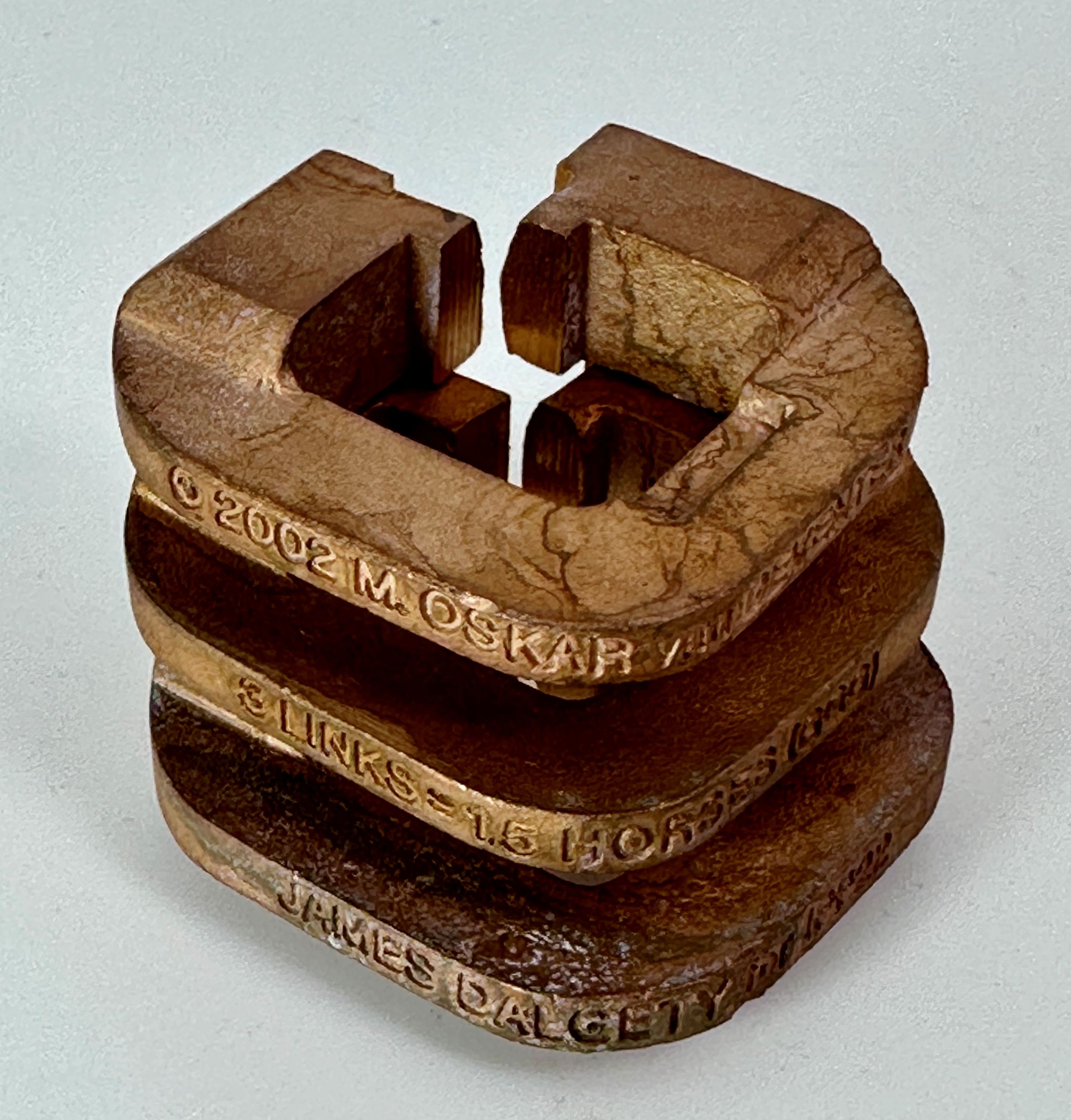 This is the original production of what came to be known in the future as Chain in Hanayama’s puzzle range. Invented by Oskar van Deventer 1998-2002 and exchanged by James Dalgety at IPP22.
