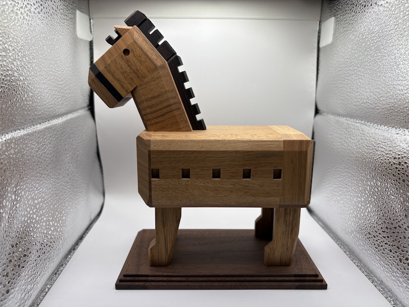 This work was produced for an exhibition on the theme of "Ancient Times." This work is based on the story of the Trojan horse. Some warriors hid in the big wooden horse in this story. A warrior is hidden in this work as well. Its figure might be visible from the window when the drawer is being opened. There are two storage spaces in this work, but both are empty. Can you find the room where the warrior is hiding?