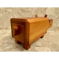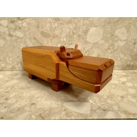 Hugo the Hippo is a trick opening puzzle box in the shape of a hippopotamus. Open the box and discover what the hippo has eaten. It does not require tools to open, so it is not a sequential discovery puzzle. However, if your fingers are too fat, you may use one of the parts as a tool.