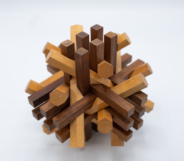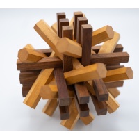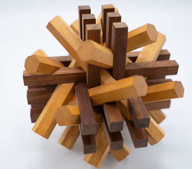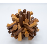 This is a copy of the Cutler Cube, a phenomenally challenging 66-piece burr and one of the first puzzles Bill Cutler ever designed. Although I am not certain, I believe this to be one of Cutler's early "Type B" originals. The finish is rough and slightly loose, but made of nicely-contrasting woods.This puzzle comes from the collection of renowned puzzler and magician Chris Morgan, a dear friend to me and so many others.Buyer to pay shipping, calculated after auction.