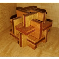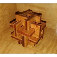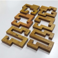 The assembled shape of the puzzle is a bit similar to Tangled Clip Burr but it consists of only 6 pieces compared to 12 of Tangled Clip Burr. Three pairs of identical pieces are used for the puzzle but if you look at the pieces carefully, you will notice that the direction of the grain of each paired piece is different. This feature gives higher symmetry for the assembled shape of the puzzle.