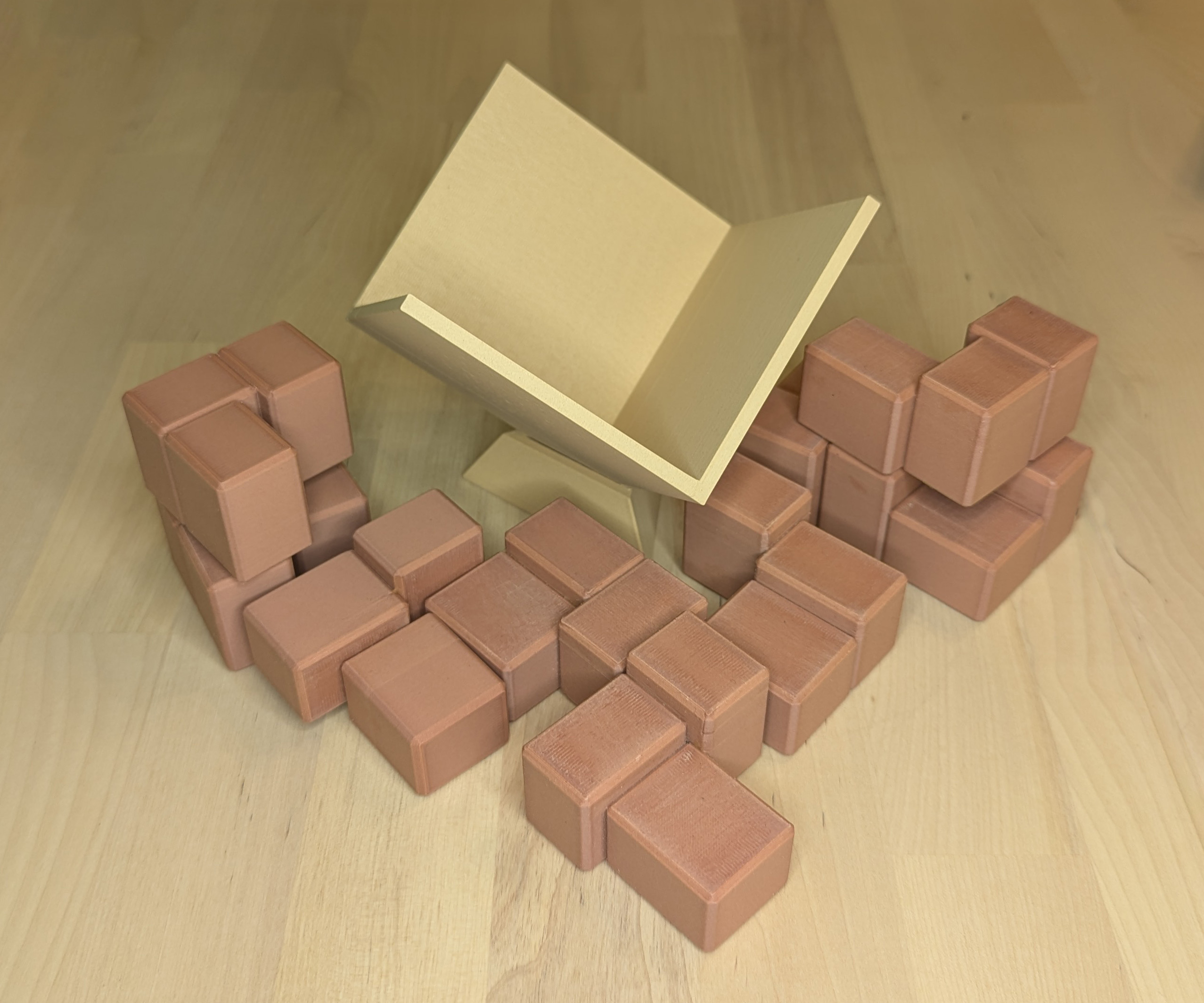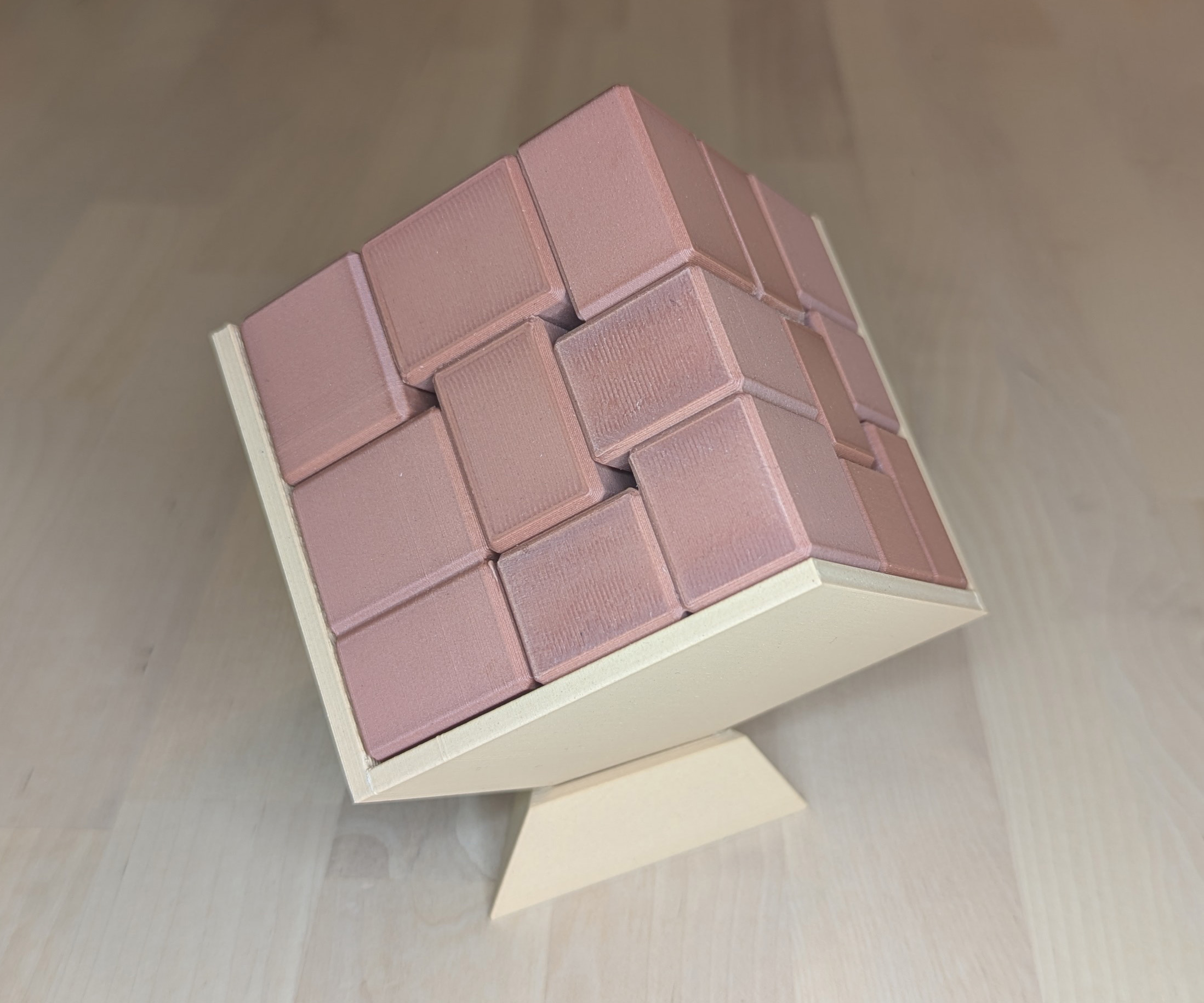 It all began in 1978. Dean Hoffman designed his Packing Puzzle, a cube made up of 27 identical pieces. But it was different from the usual; it was imperfect, because its volume was smaller than that of the box it was contained in. Despite its six completely parallel faces, it contained empty spaces. This cube had 21 valid solutions.