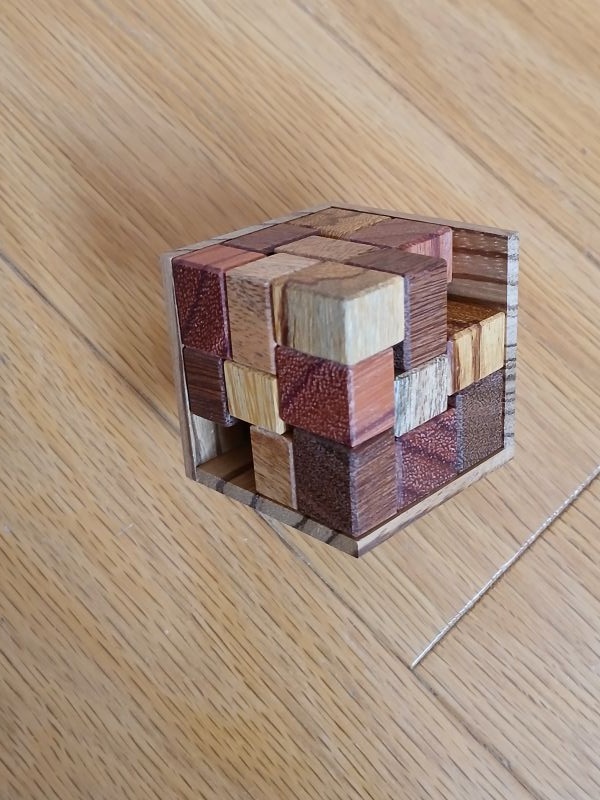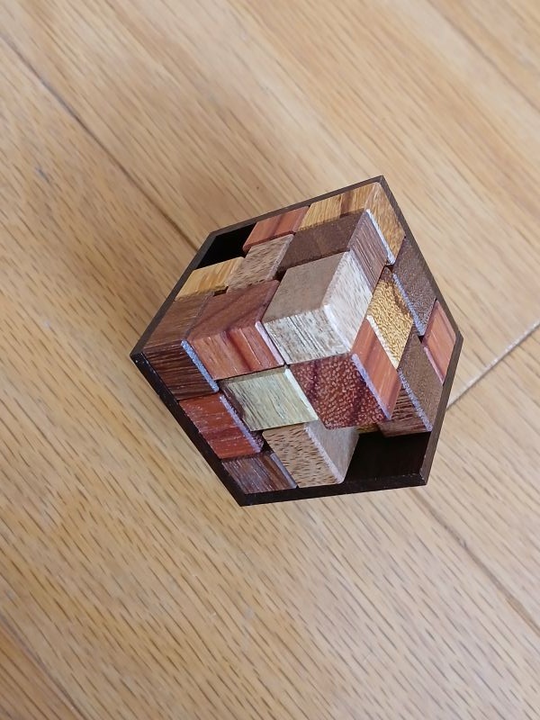 The Inelegant series of puzzles is a fairly unusual assembly or packing puzzle. The goal is to simply assemble the pieces into a cube. But each puzzle in the series delights in messing with the underlying design of the pieces. They started with the Inelegant Soma where the pieces were based on the Soma Cube design, but the voxels were stretched from being cubes into rectangular voxels that got glued into the Soma pieces we know and love. However this "distortion" results in forming a cube that appears to have gaps or voids between the pieces. This deceptively adds to the challenge of putting the pieces together, because unlike with most apparent cube puzzles, solvers can't simply put the pieces together until there is no gaps between individual parts as if assembling a 3d jigsaw. And Haym went on to design multiple variants on that original design spawning the Inelegant series.