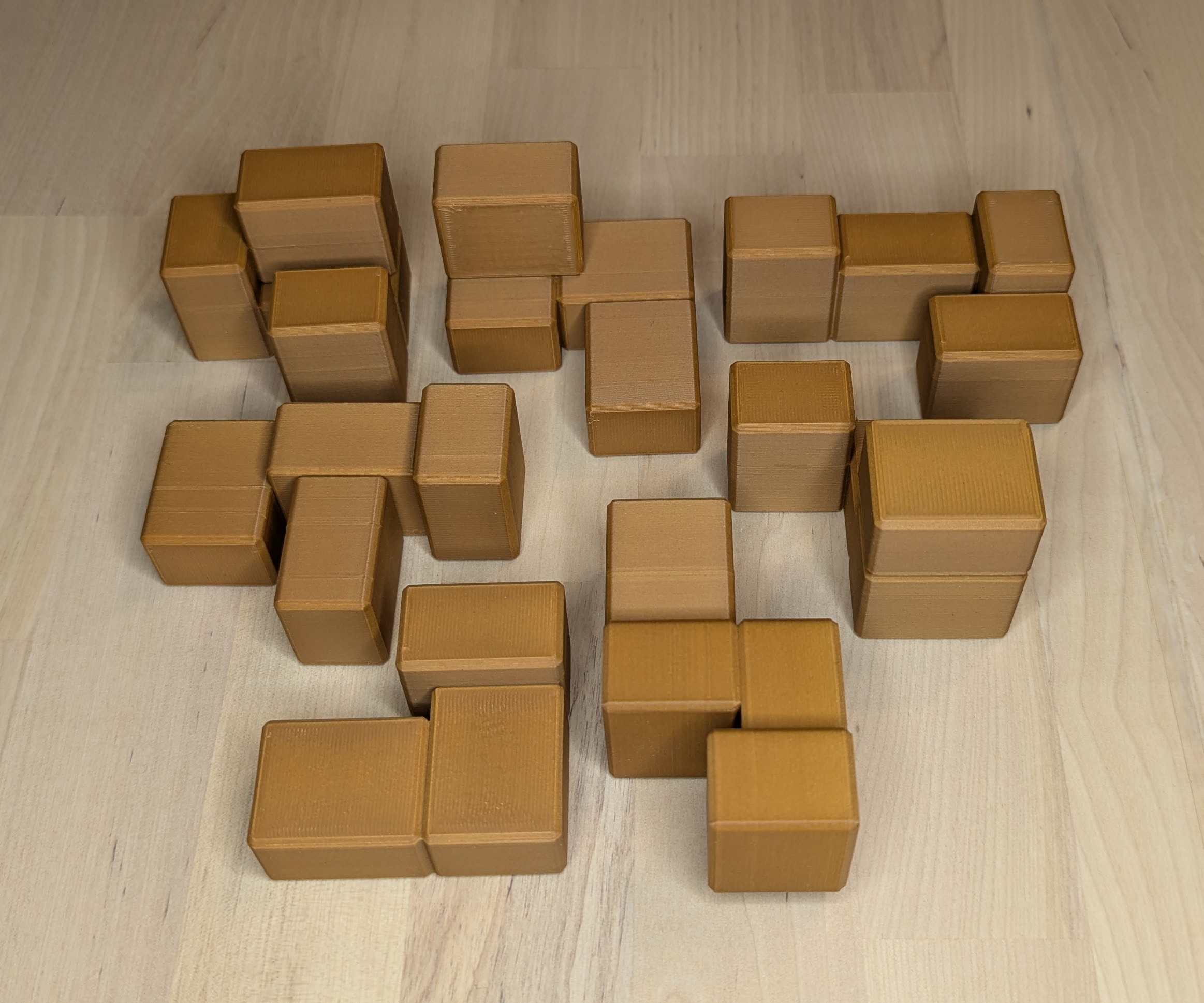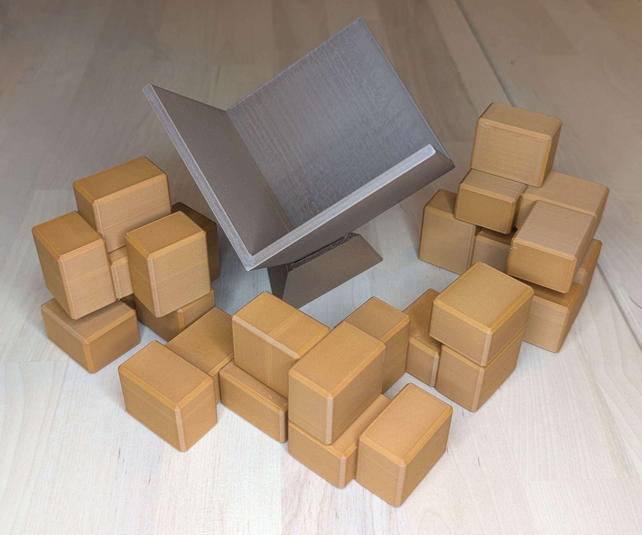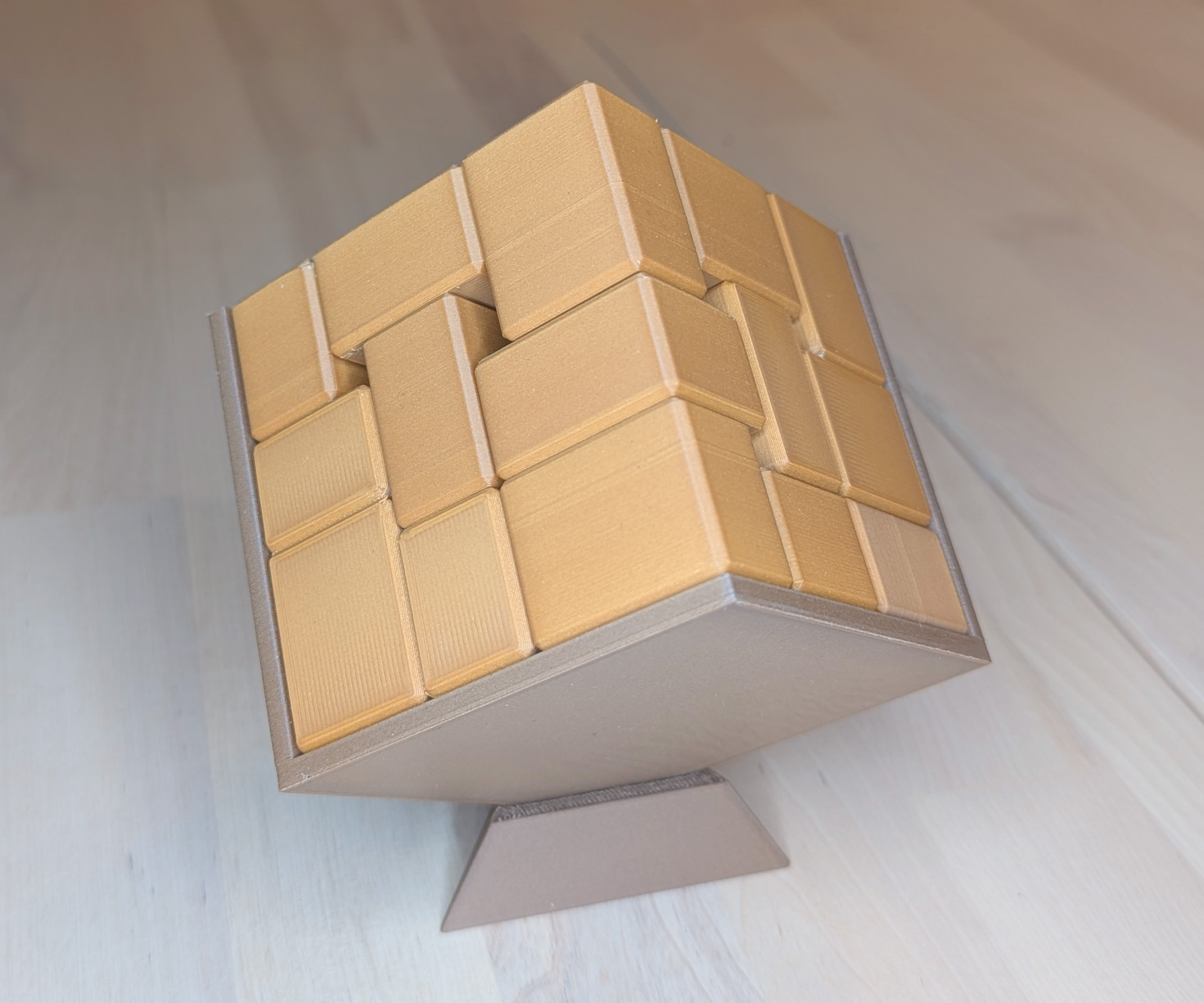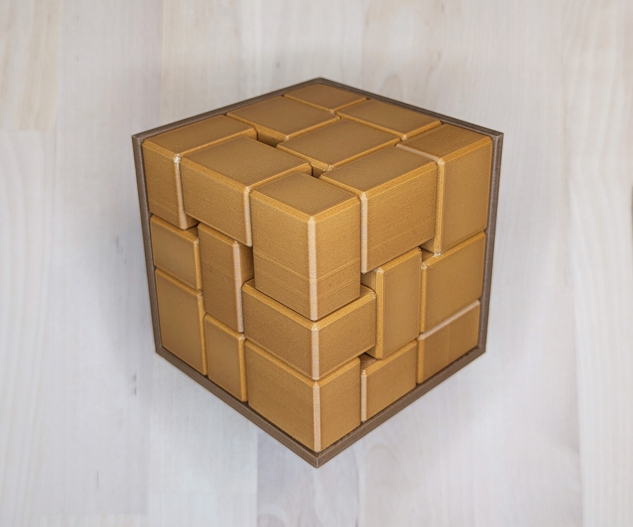 This puzzle is printed with two different Wood filaments and so has a pleasant woody look.