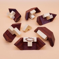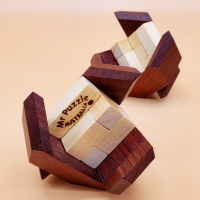 6BB Oddly Extended Version #01by JUNO production year: 2021materials: Rosewood, New Guinea Walnutdescription: A large, modified 6-board burr where the standard piece length and voids are thoughtfully extended to allow more complex internal motion without compromising stability, producing a unique multi-stage unlocking sequence. It has a specific level 19-11-4-2 solution and no expected rotational shortcuts, requiring careful navigation of the expanded void spaces before the first piece can be f...