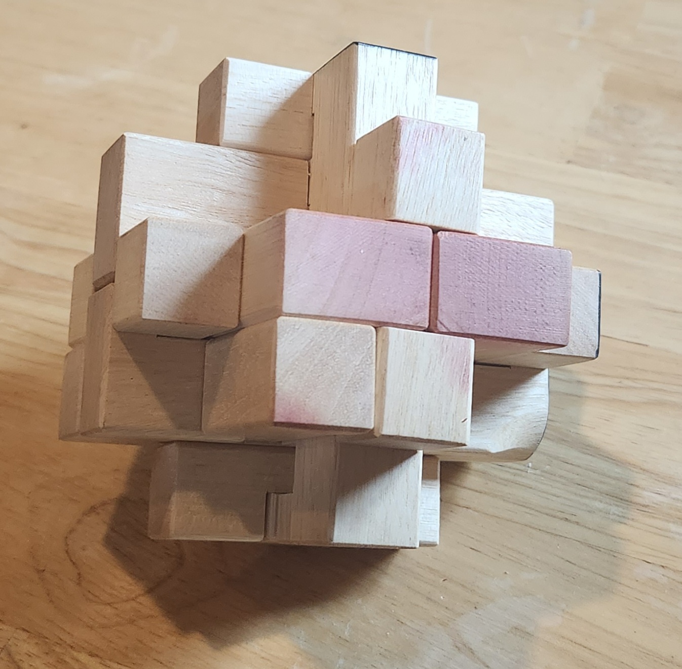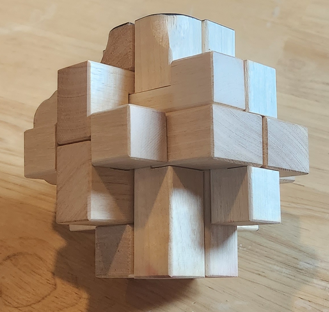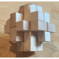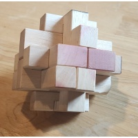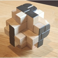 Brian created a completely new burr design for IPP. The puzzle was not used as an IPP exchange puzzle. Just a fun burr to represent the logo. It has 14 interlocking pieces and takes 13 directional moves to remove the first piece.