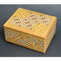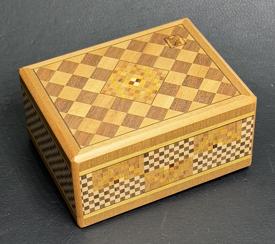 This secret box is irregular and opens in 4 turns. This is an irregular open type secret box. There are 5 different kinds of checked Yosegi patterns. It is a distinctive characteristic of this work.