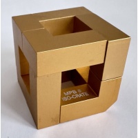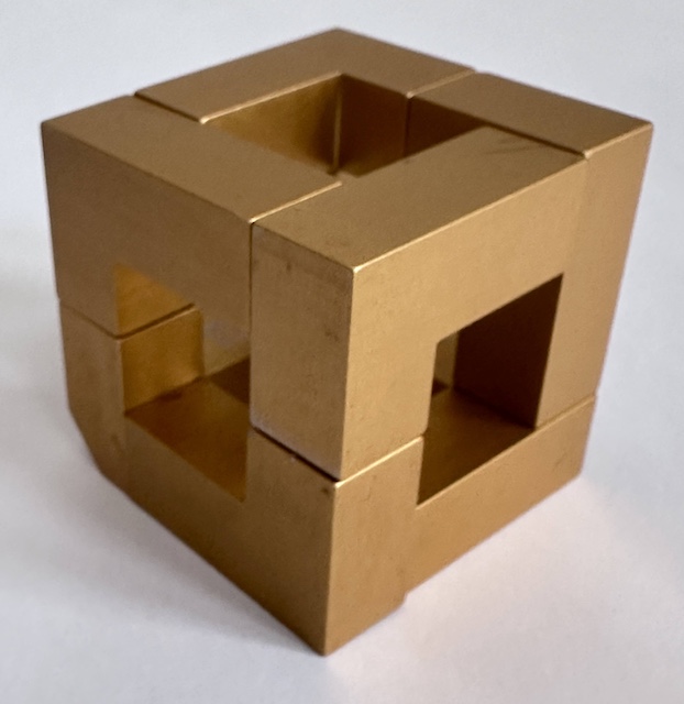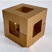 CNC milled, solid aluminum pieces form a gold tone aluminum cube, a fun puzzle and awesome display piece.