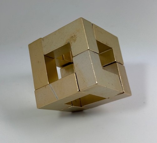 A metal puzzle designed by Robert Rose and made by Bits and Pieces. The puzzle has eight pieces and each piece has 3 magnets in it.