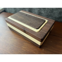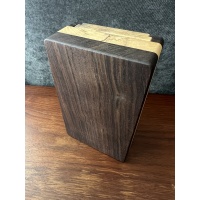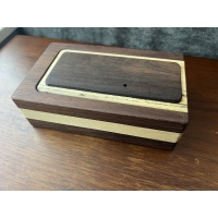 Iteration 23 is an SD puzzle with over 20 steps.  The goal is to find the 4 compartments and assemble the components in an attempt to defeat Walter. Three variants are available. They are padauk, osage orange, and spalted hackberry each paired with Peruvian walnut. A quick word about spalted hackberry: spalted hackberry happens when the hackberry tree has been exposed to decay. The light colored heartwood is streaked with black lines which is actually fungus. Tiny voids are normal in spalted woods and are not defects. This puzzle measures 7" x 4.25" x 2.25".