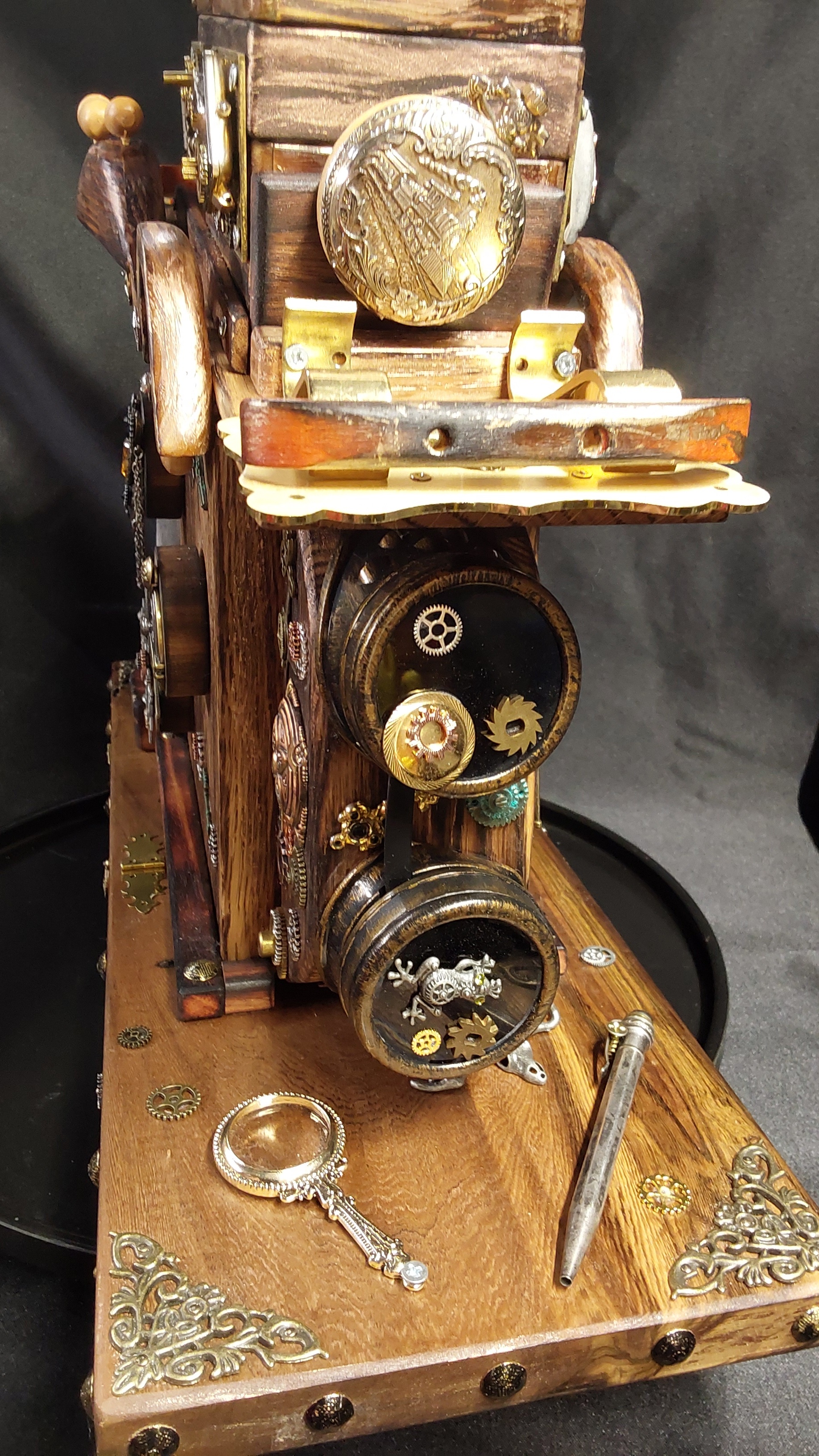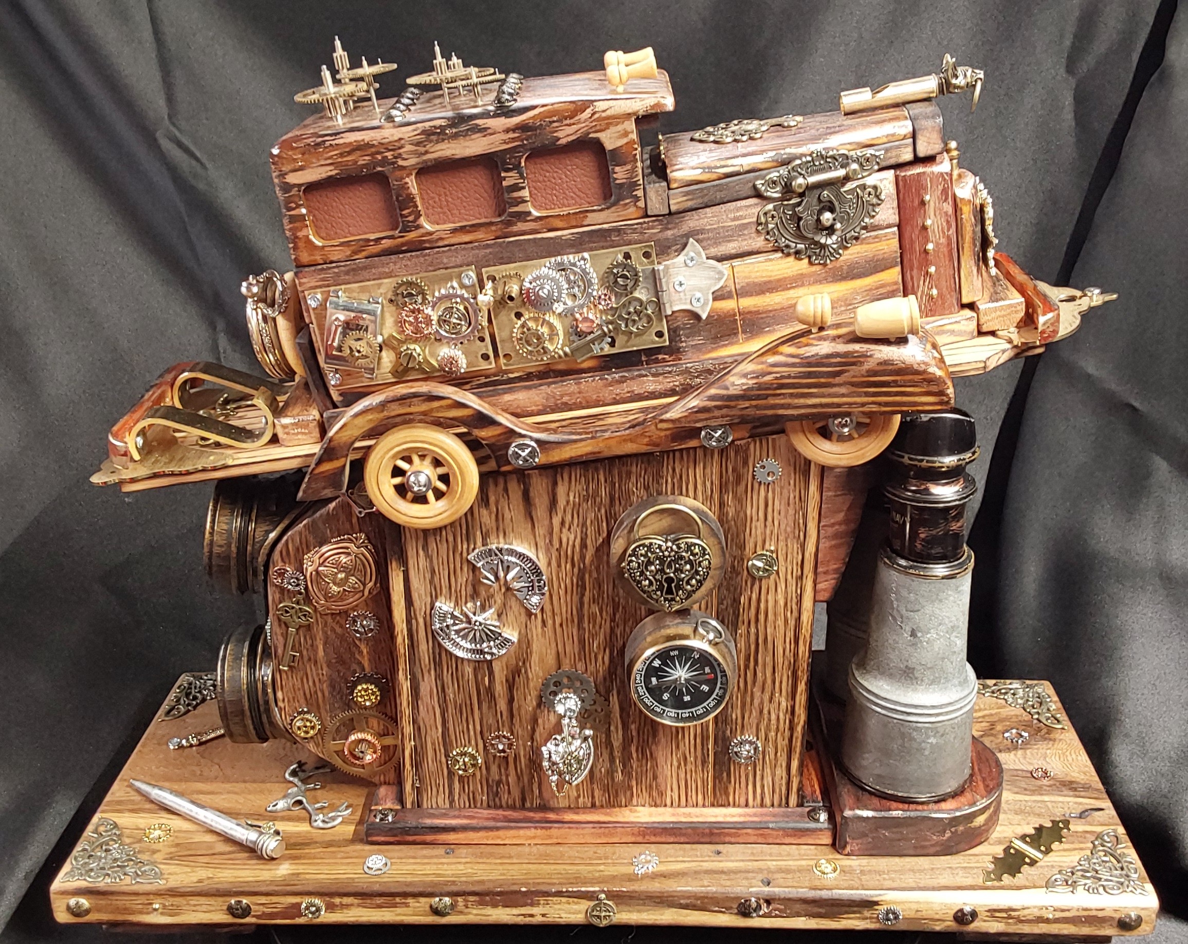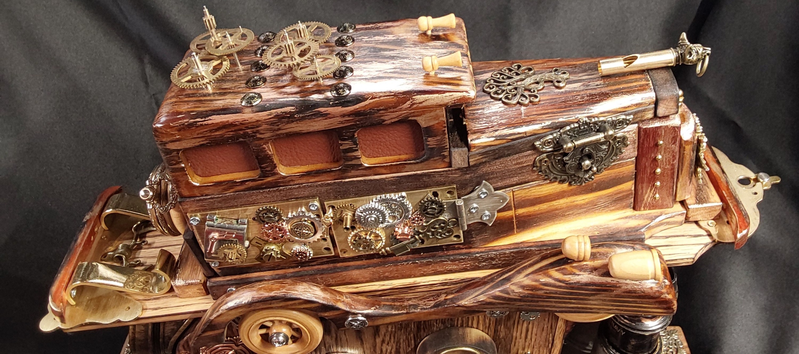 At first glance, this creation clearly leans into the steampunk aesthetic — wood, brass, gears, mechanical fragments, and antique-looking instruments. But this is not simply a decorative steampunk art piece. It is a sequential discovery puzzle box, designed to be explored, questioned, and slowly revealed.