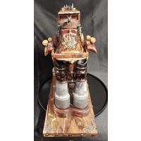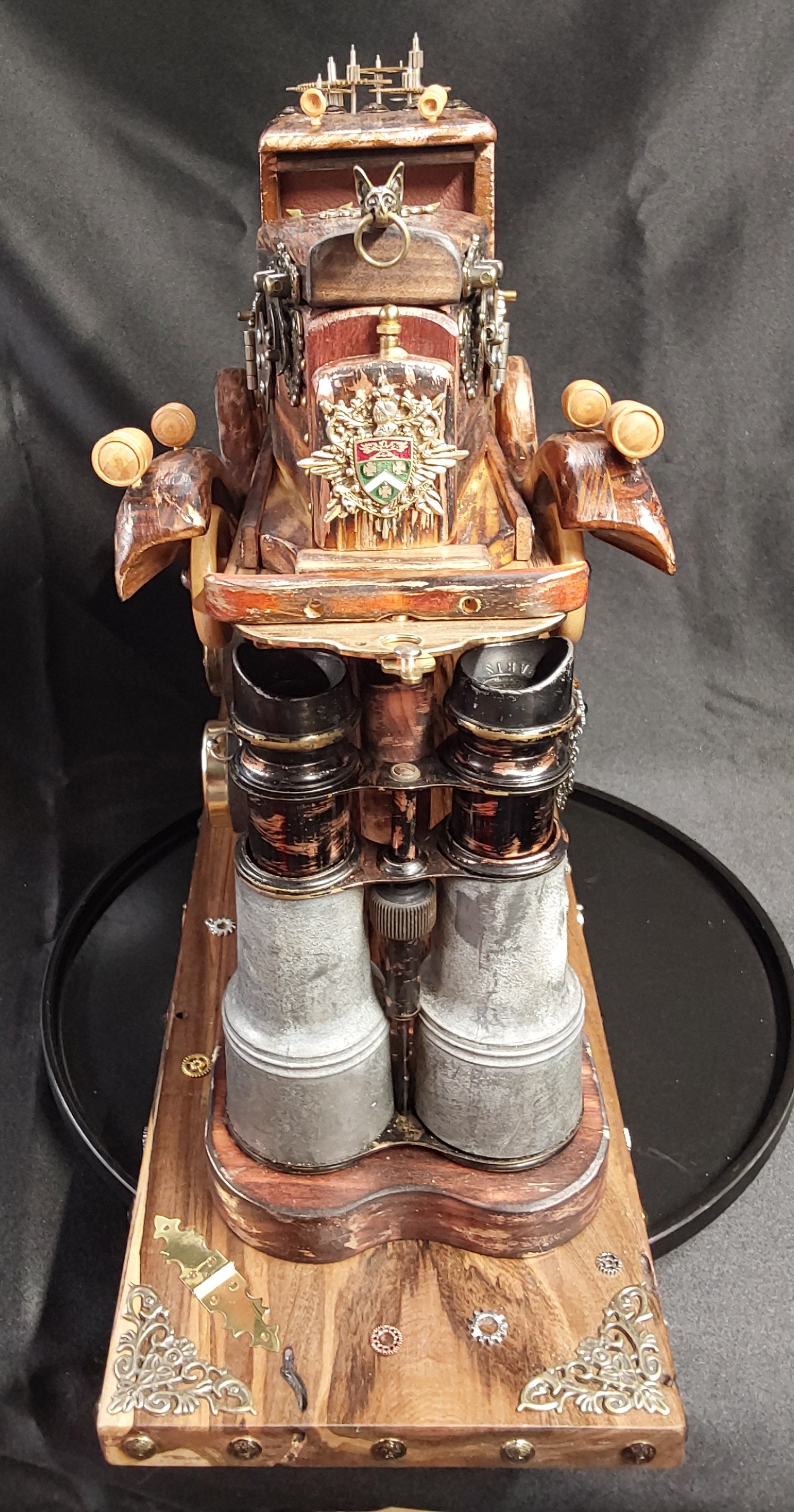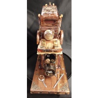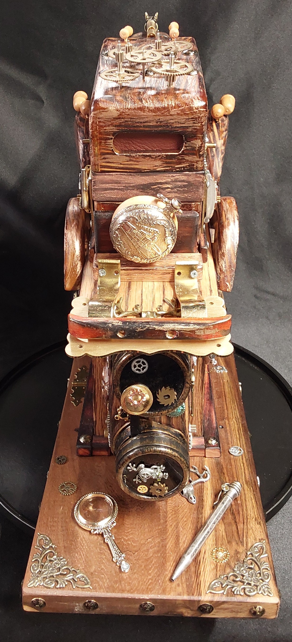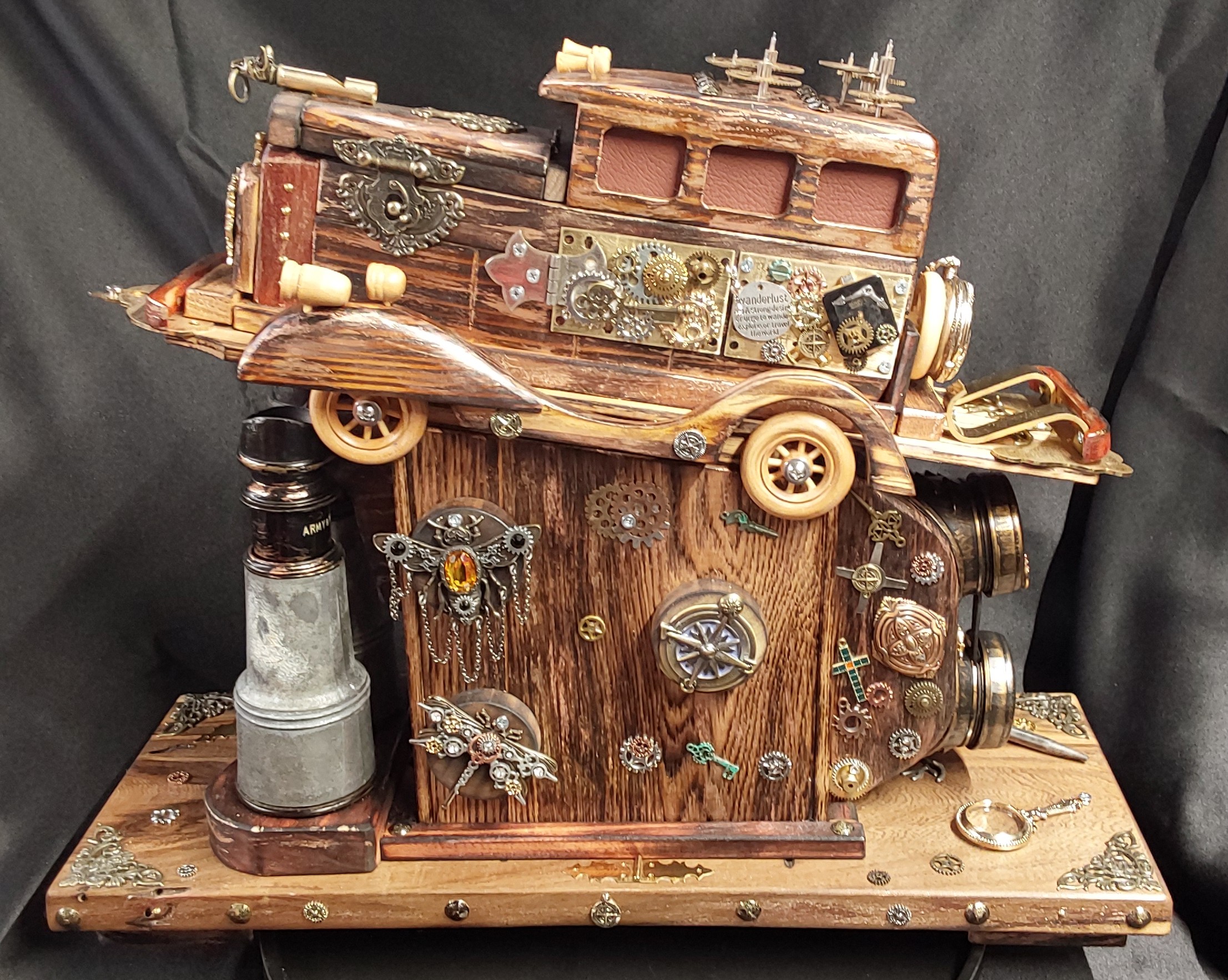At first glance, this creation clearly leans into the steampunk aesthetic — wood, brass, gears, mechanical fragments, and antique-looking instruments. But this is not simply a decorative steampunk art piece. It is a sequential discovery puzzle box, designed to be explored, questioned, and slowly revealed.