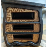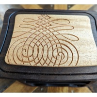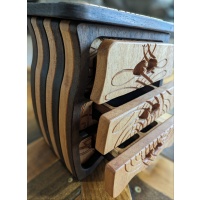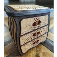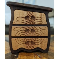 This jewelry box/cabinet is made from Peruvian walnut and African striped mahogany. It has three drawers and features three carvings that are incorporated into the design and goes well with the box's whimsical shape. I like to use exotic woods left over from puzzle builds and challenge myself to utilize it in different and creative ways. This box is also suitable for other small items besides jewelry. Measurements are 9 x 7.5 x 5 in. and weighs a hefty 5lbs. This listing is not a puzzle but it does have a hidden compartment large enough to store the code to your secret puzzle vault.