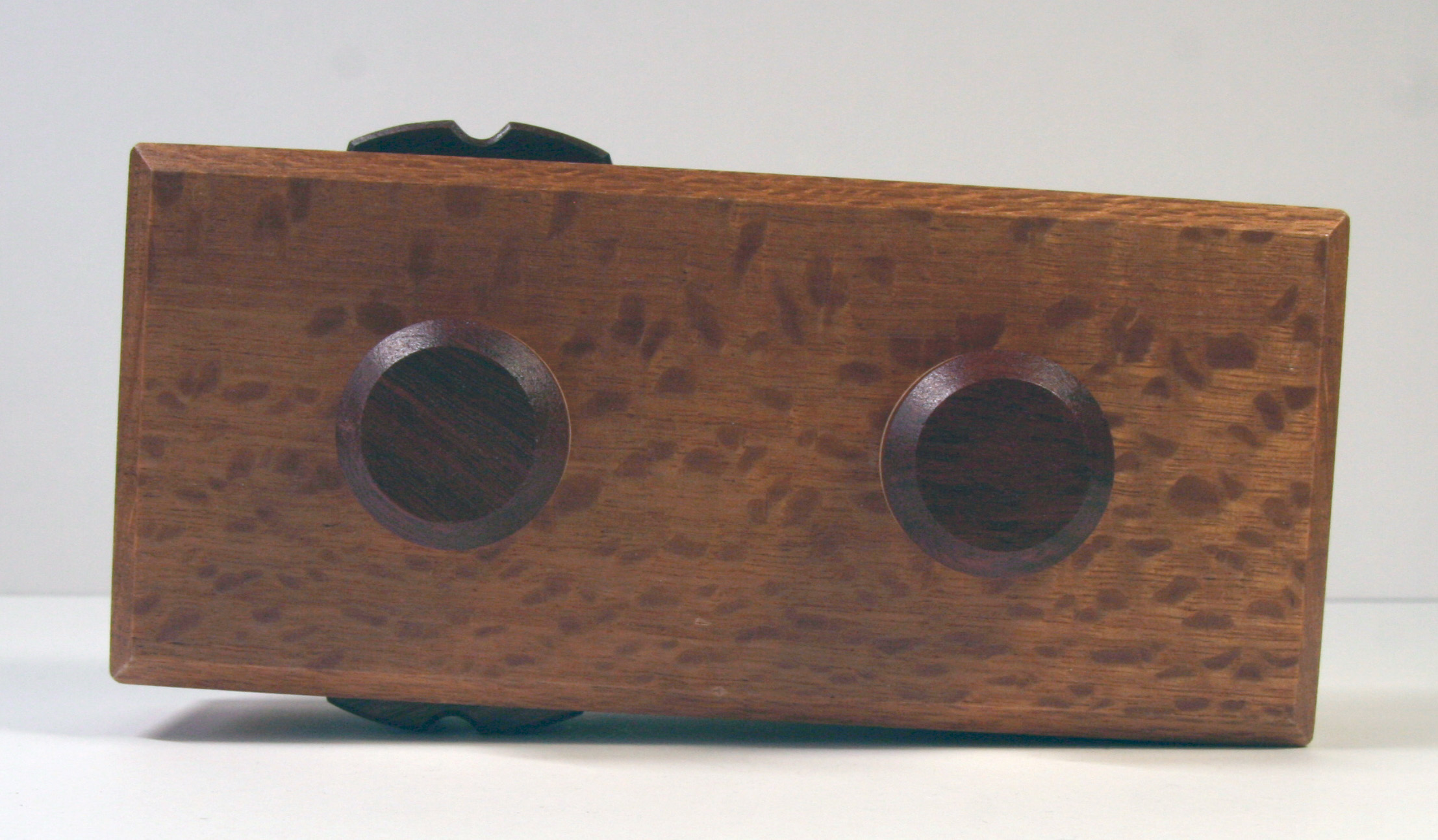 designed by Dic Sonneveld in the late 90's and made by Tom Lensch, though i don't know what year he made it.the cage is made from blue mahoe, avodire, and primavera, with burr pieces made from granadillo (a.k.a Mexican rosewood). this is the complete description from puzzleworld.org: A three-piece burr is contained within the cube. It is very difficult to disassemble and assemble, requiring rotations and other unnatural acts in addition to the usual burr movements. ...