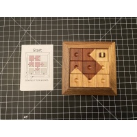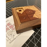 Each sliding piece has grooves on two sides and one of the grooves goes halfway along the edge. A pin is set on the opposite side of the half-length groove. The tray also has grooves on two sides on the inside. These features give diabolically balanced restriction to the movement of the sliding pieces and makes the puzzle extremely difficult.
