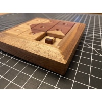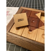 Juno originally designed this puzzle in 1995. He made only two of them using very basic tools. Now, we have lots of machinery and can produce hundreds of puzzles in less time. The major parts of the pieces are milled out by a CNC router, then glued, sanded, and polished. The concave on the top of the pieces make it easy to slide them. Although it is an old design, we believe a very limited number of the puzzles was available in the past because of the difficulty of mass production.