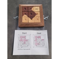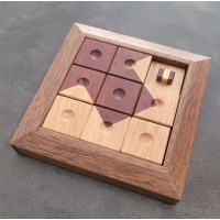 A puzzle as beautiful as it is difficult. The goal is to slide the pieces to change their configuration so that you get a light colored arrow. It comes with original instruction sheet. The frame has grooves, while the pieces have grooves and pins that restrict the possible movements. I am not the original buyer but the puzzle is still in great condition. Note: the frame has a really light and small scratch not too visible in the photos but on very close live inspection it can be seen. The puzzle is sold out, more info here: Archived puzzle (Pluredro)