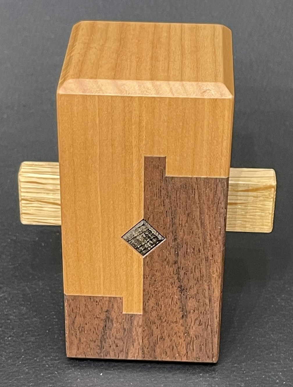 Per the Karakuri website:SOGO BoxcraftsmanShou SugimotoITEMSS-9Created9/2019Size(box body)90×90×90mmSize(storage part)35×35×35mmMaterialwalnut, maple, keyaki, magnoliaFacebookTwitter共有This work was designed for Karakuri Puzzle Party in Hakone 2019. I've always wanted to create a work that uses a structure of kumiki. Finally I was able to execute it. My work always has one answer. This time it is a nasty device. The surface has a pattern of alternating three-color chips on all six sides.T...