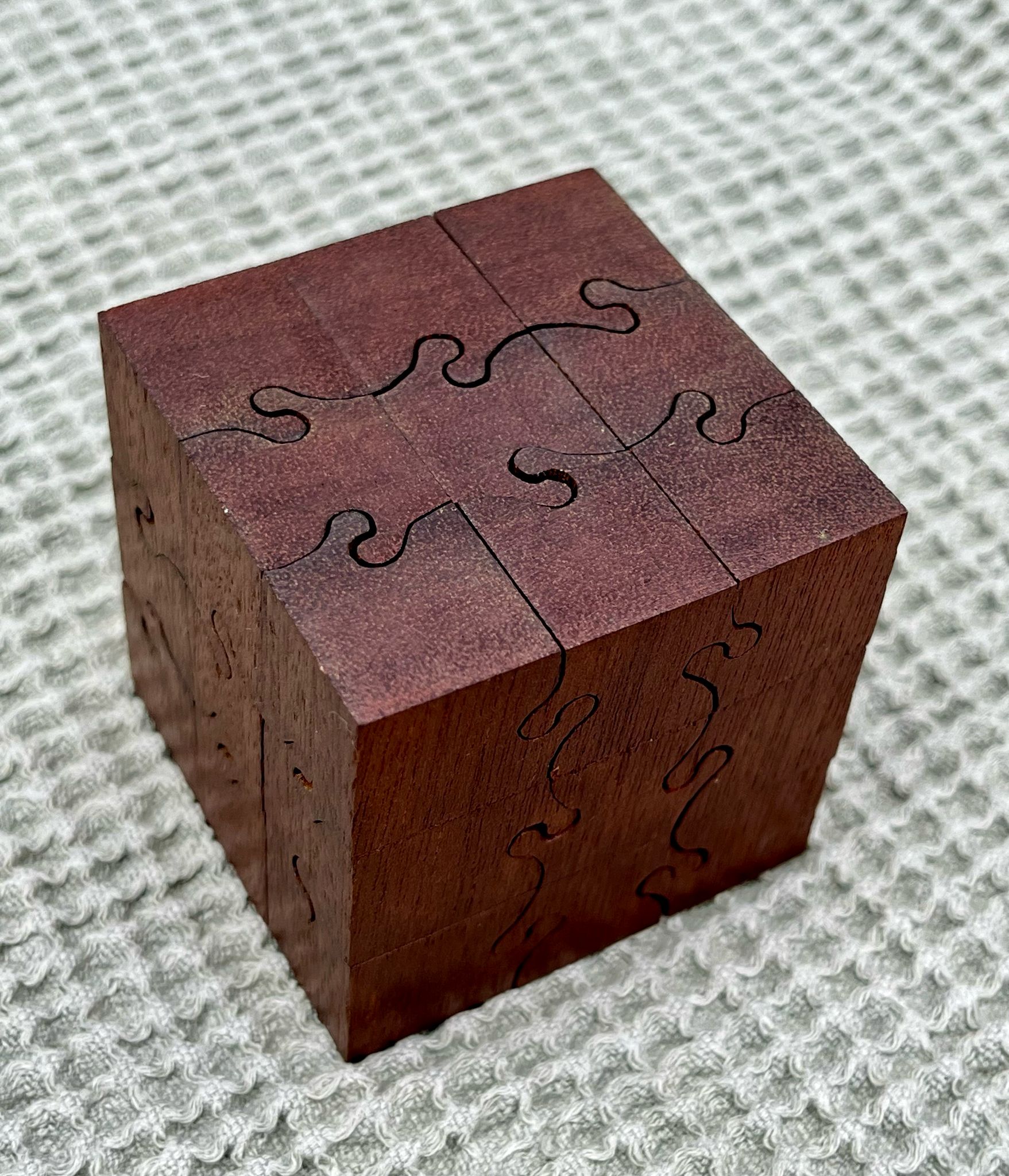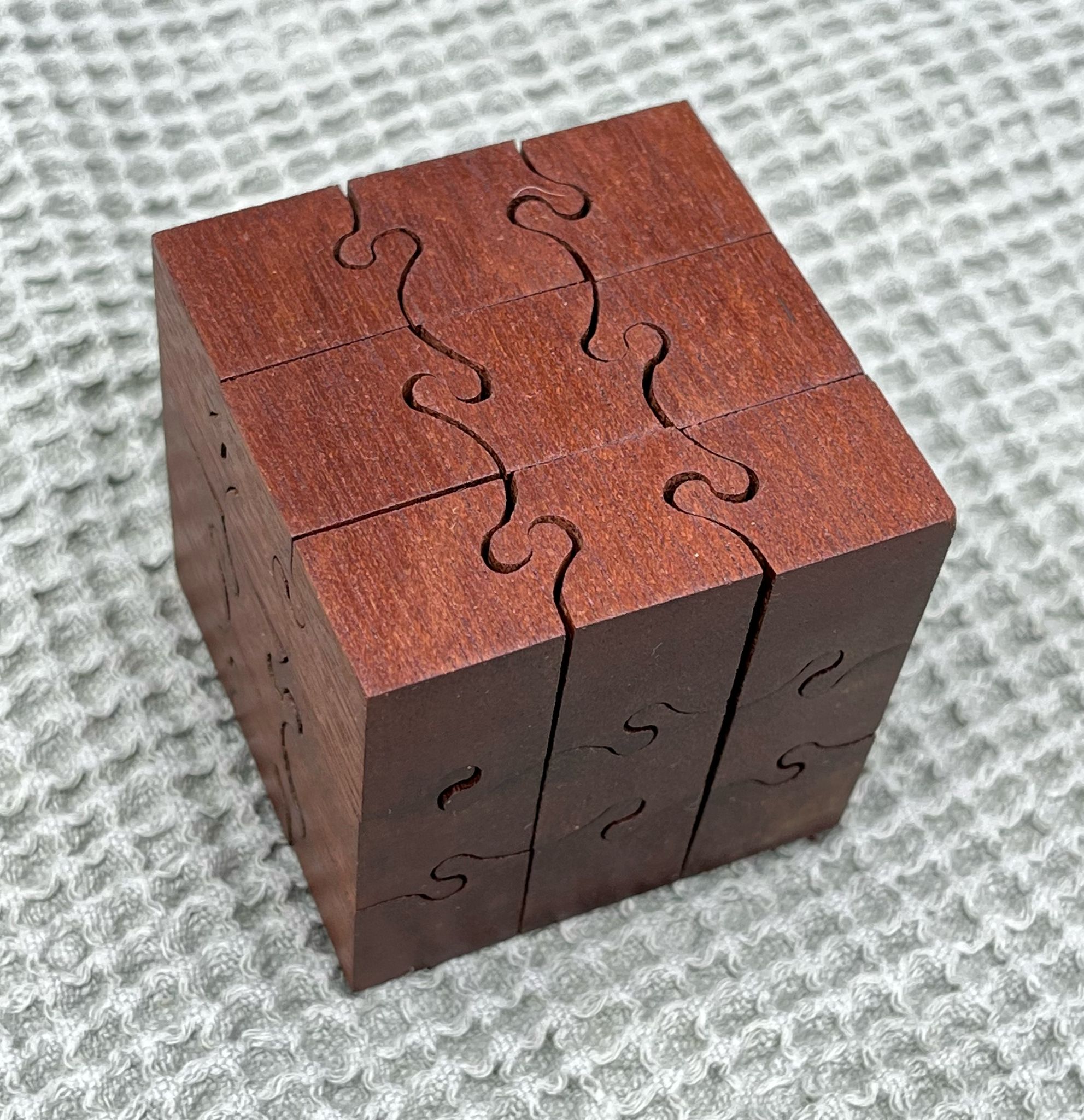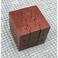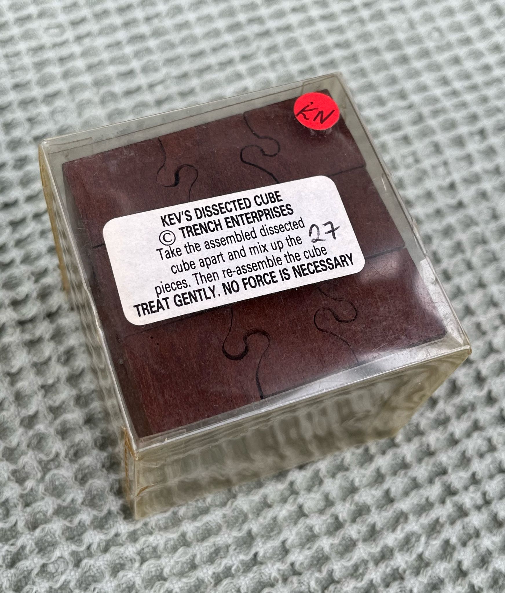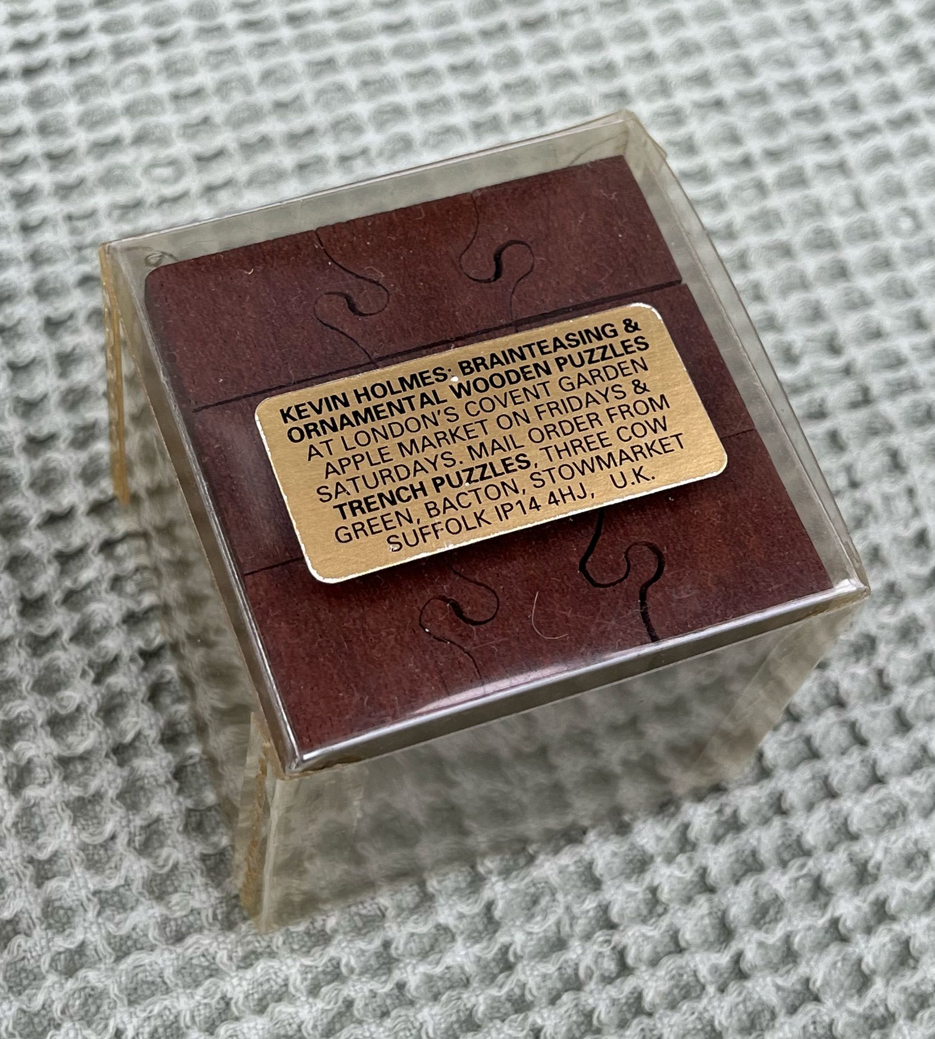 This puzzle was designed by Kevin Holmes and made by Trench Enterprises. Solved once and in great condition. Description: "Take the assembled dissected cube apart and mix up the (27) pieces". Comes with the original plastic case.