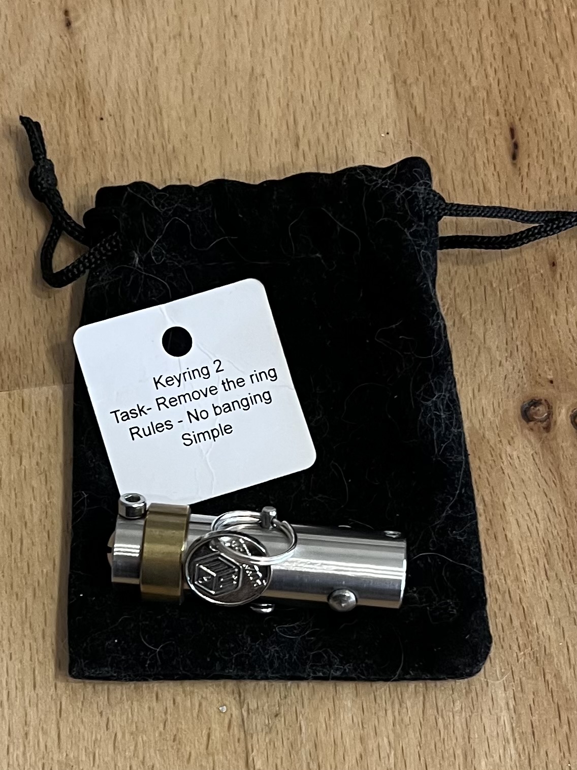 Made from stainless steel/alluminium with a brass ring this is designed to be carried on your key chain for on the go puzzling