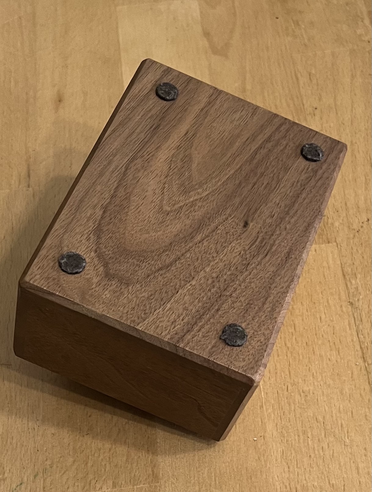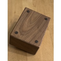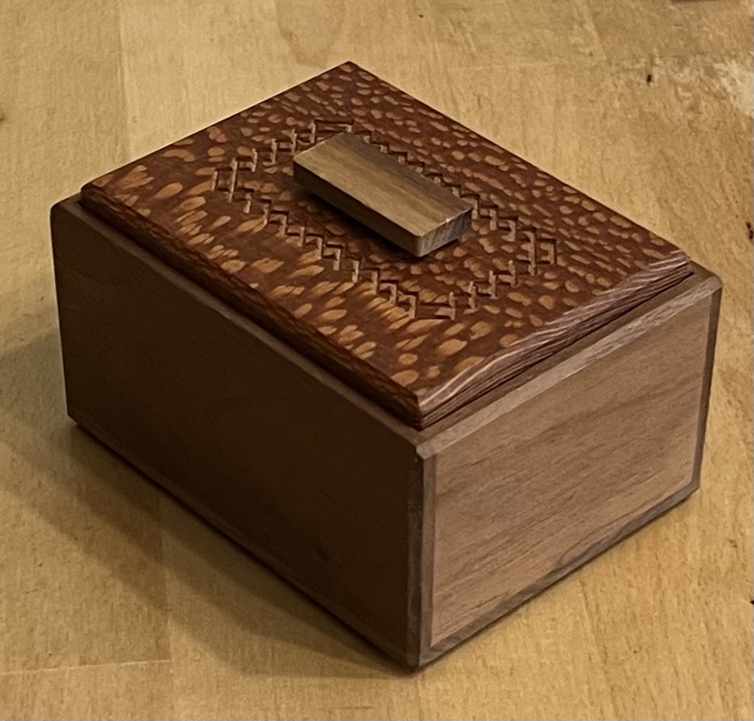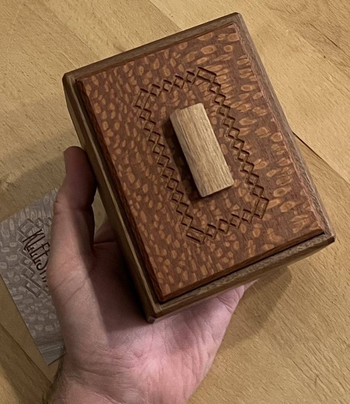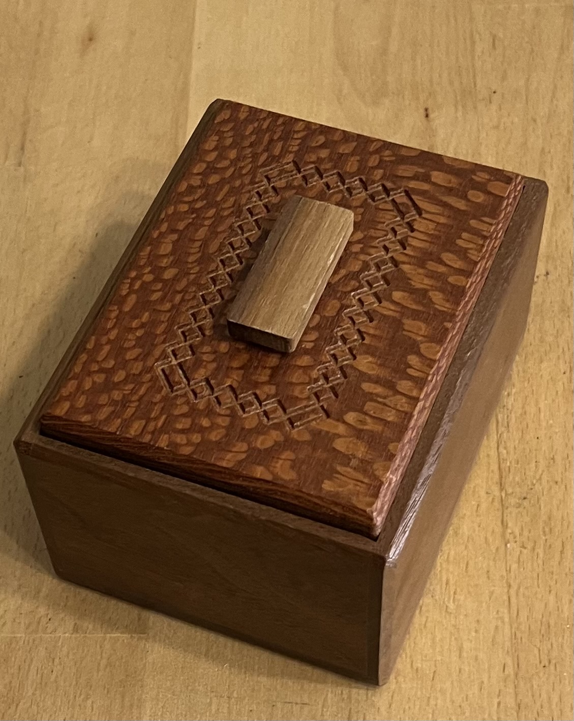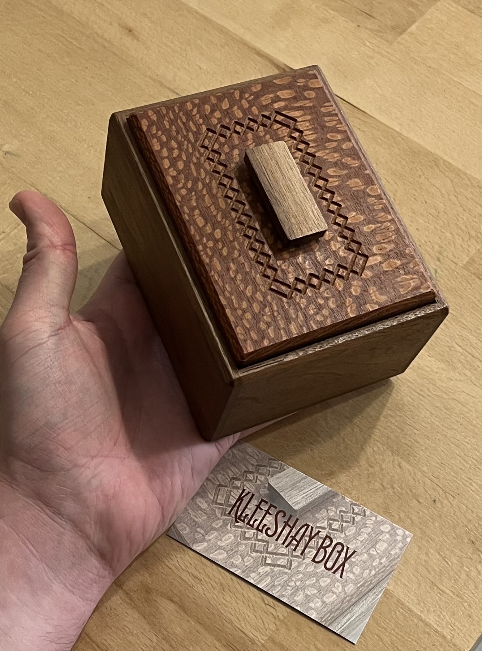 "What started out as a simpler solve intended for beginning puzzlers ended up being much more challenging. Kleeshay Box is crafted using the rich, dark tones of superior black walnut paired beautifully with the striking leopard pattern of lacewood. It is part trick opening, part sequential discovery. Several moves are needed to solve the puzzle. Kleeshay Box measures 5" x 4" x 3"."