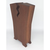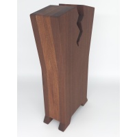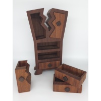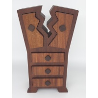 This design is called Cracked Box and is a fun project among woodworkers. I've put my own spin on it and implemented a secret locking drawer. It stands 18in tall 10in wide and 4in deep. Two deep and three shallow drawers one of which locks make up the storage areas. Made from sapele, African stripped mahogany and Peruvian walnut. Small imperfections can be found.