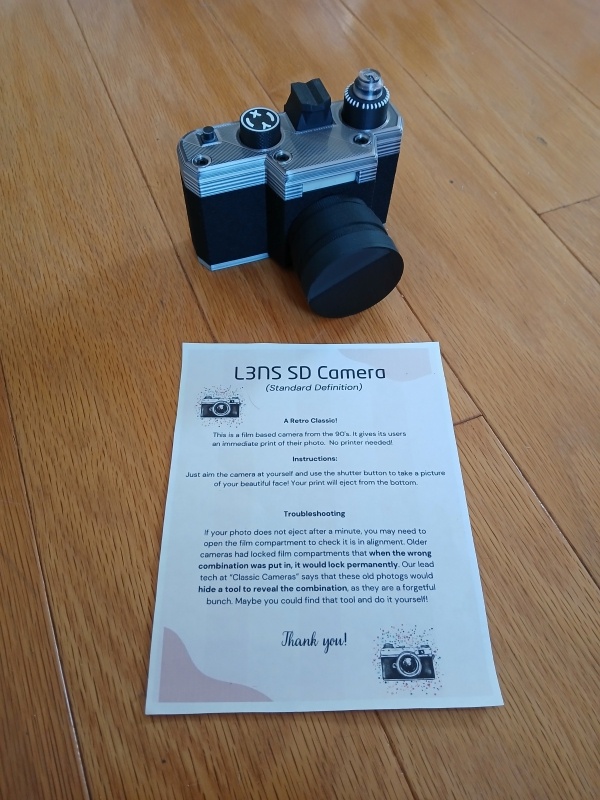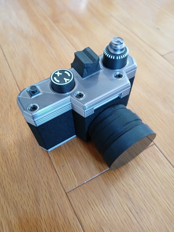 However, it's been redesigned and expanded on beyond the original 7-8 steps for a longer, trickier solve and for some quality of life improvements by Kris Antibus. The print has glossy reflective surfaces, rougher edge for a nicer grip, color changes on the dials, and a lovely iridescent shine on the cap of the camera.