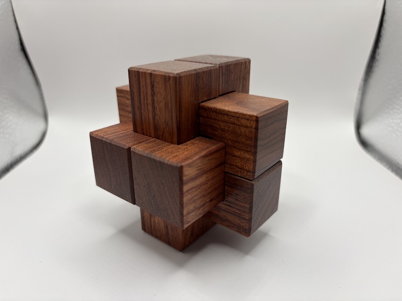 The material used is Bubinga, the same as Juno's L7 Notchable. Two of the pieces have embedded magnets to ensure the assembled puzzle remains stable.