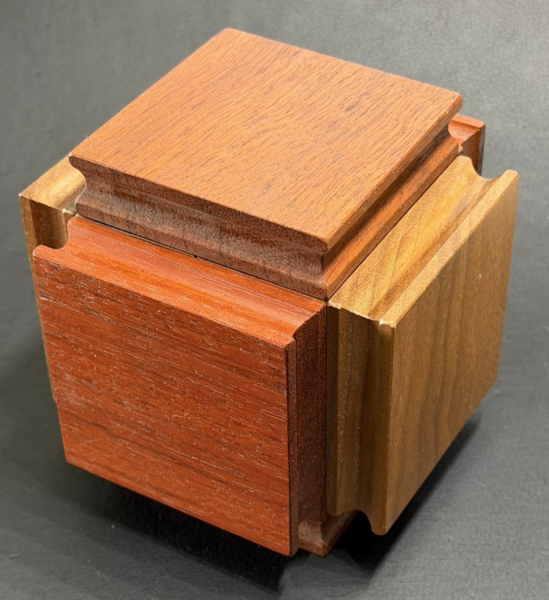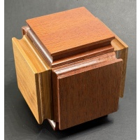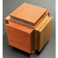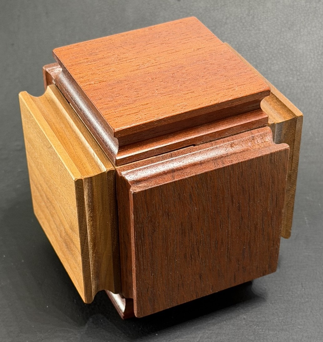 The puzzle is a 5" cube that weighs in at almost two pounds.  It's made from walnut, jatoba, and jarrah.