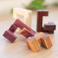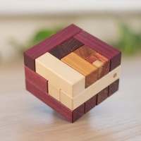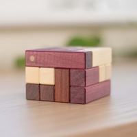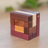 The woods are so lovely! It's made with exotic hardwoods Makore, Purpleheart, Holly and Sneezewood that give the puzzle beauty and such a heavy weight to it. (which made me love it even more).