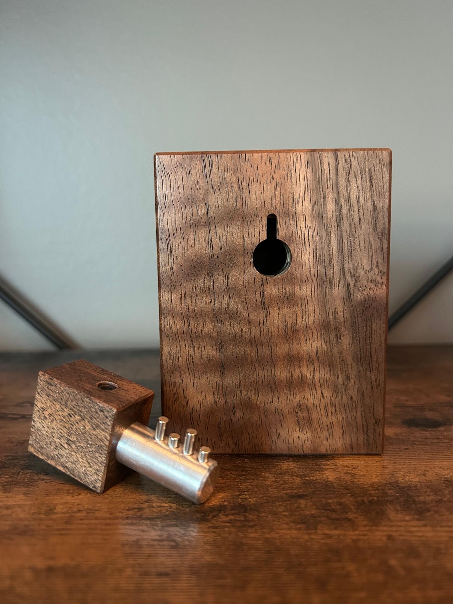 This is also our first puzzle that incorporates precision-milled metal components combined with fine woodworking. The shining aluminum key shaft really stands out against the intricate visual texture of the wood.