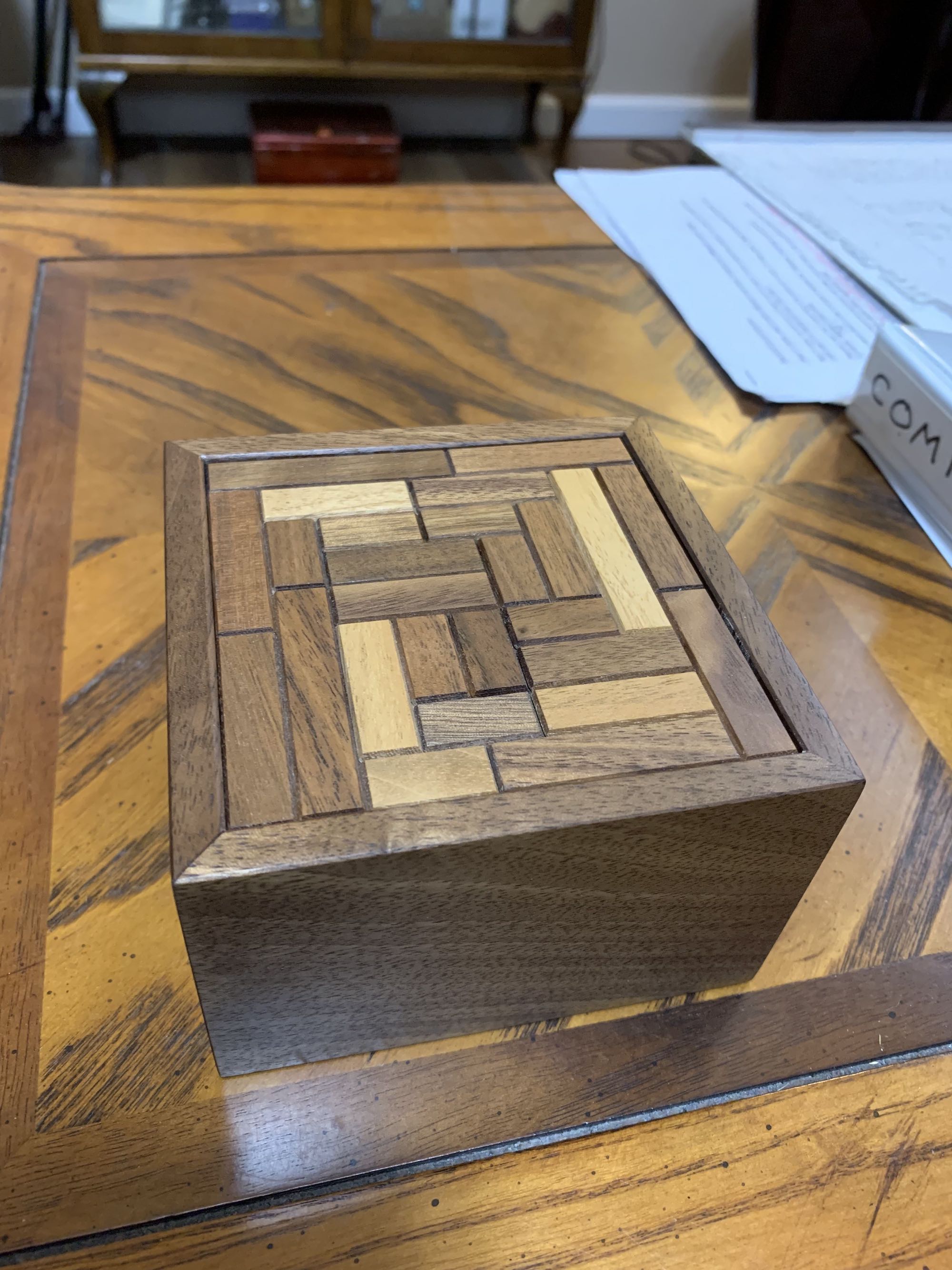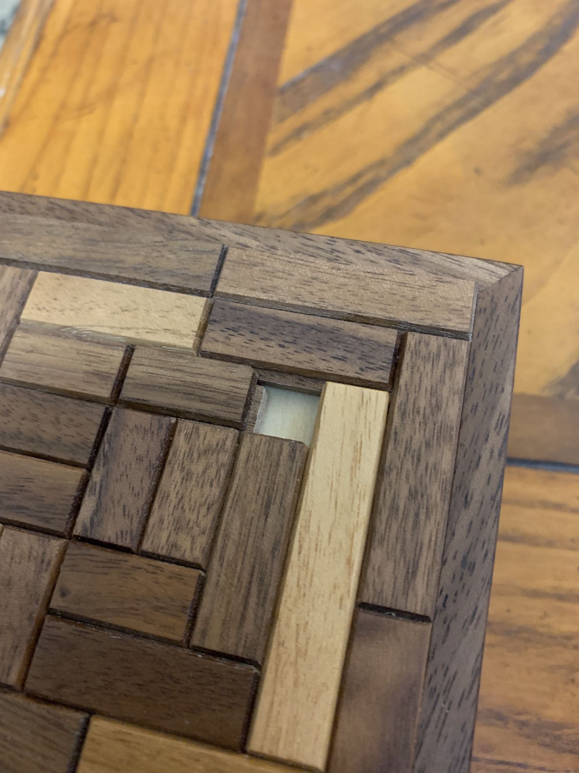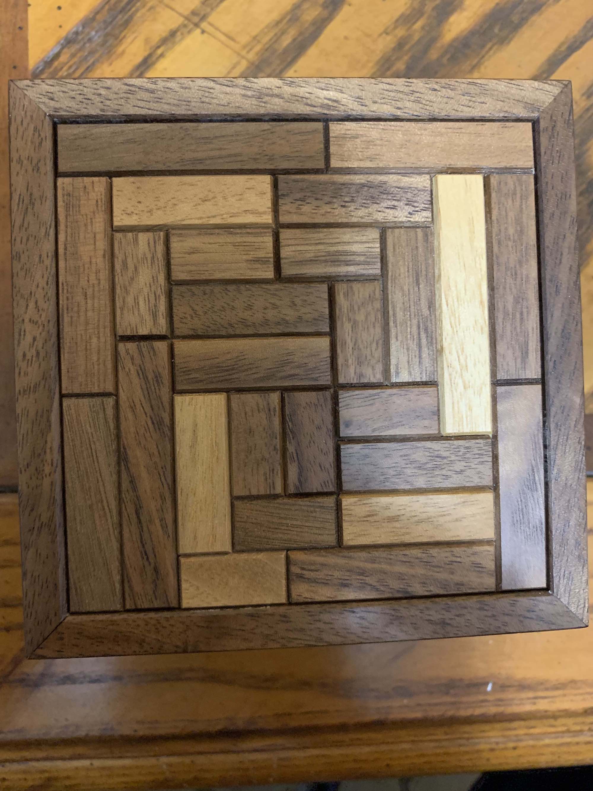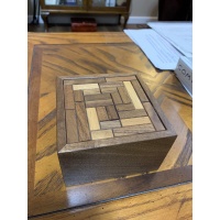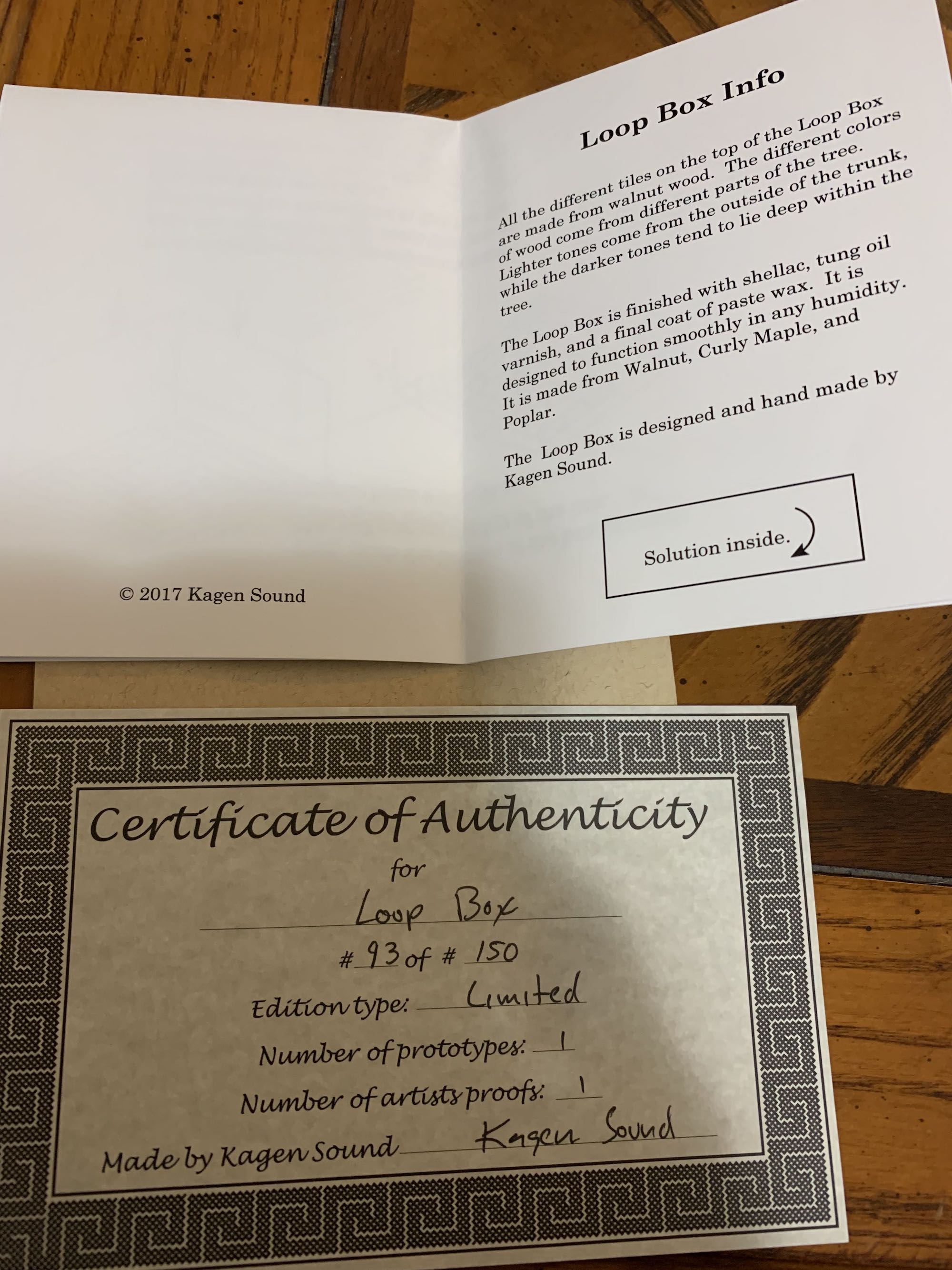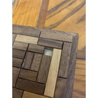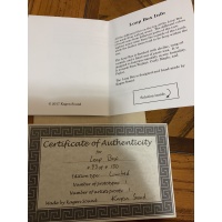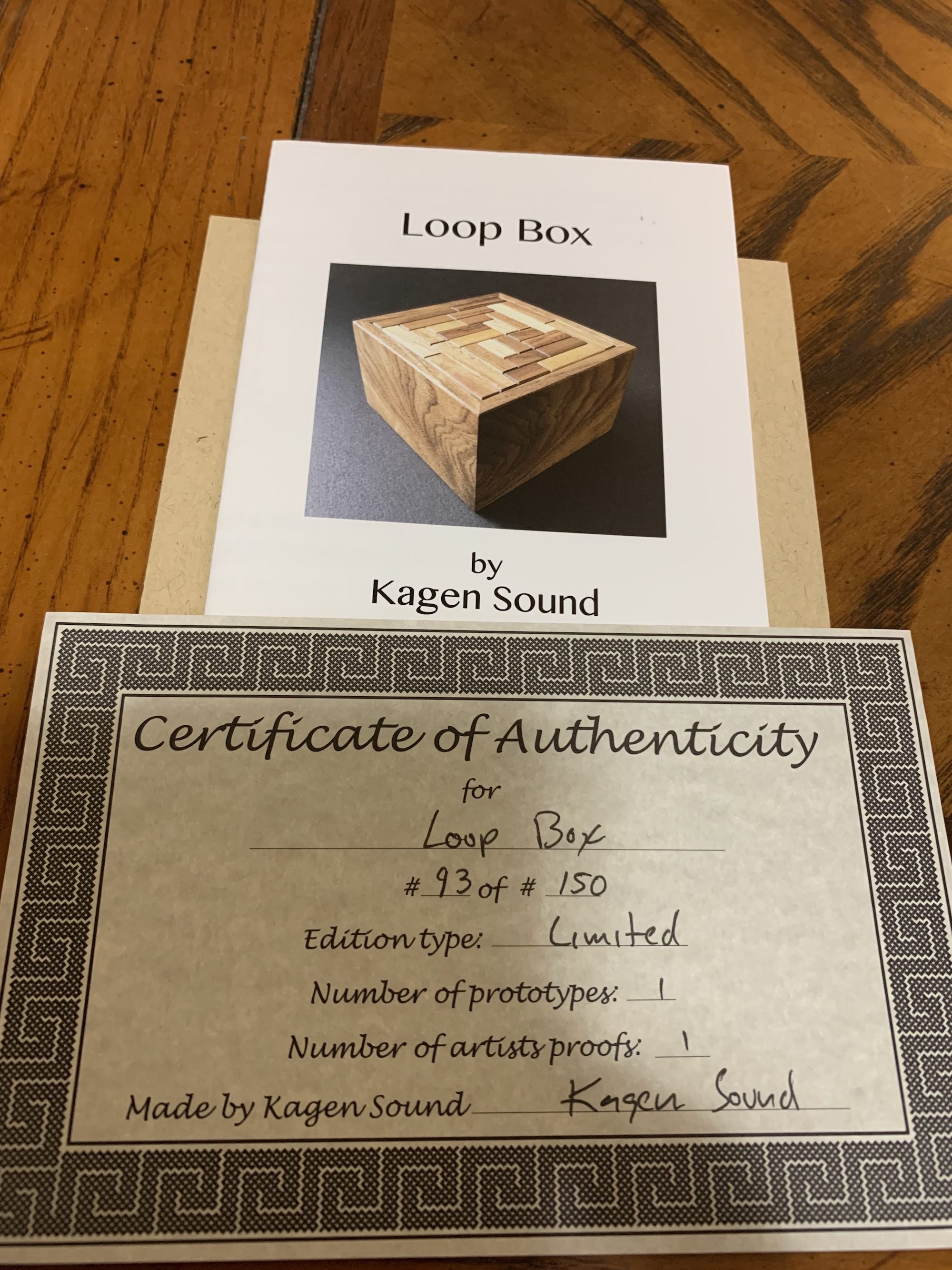 Loop Box, made by Kagen Sound, 150 copies made in 2017. There is some slight wear at the ends of some of the many sliding pieces, but it’s difficult to see, and has no effect on the function of the puzzle.  See pictures for example. Also comes with the solution sheet and the COA.