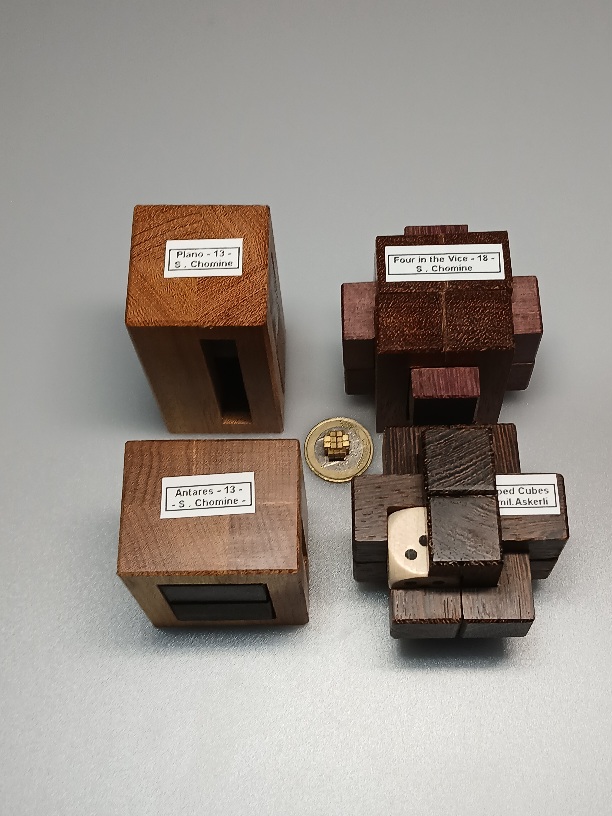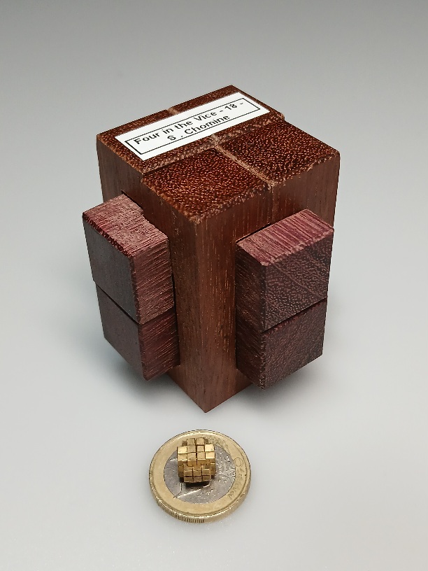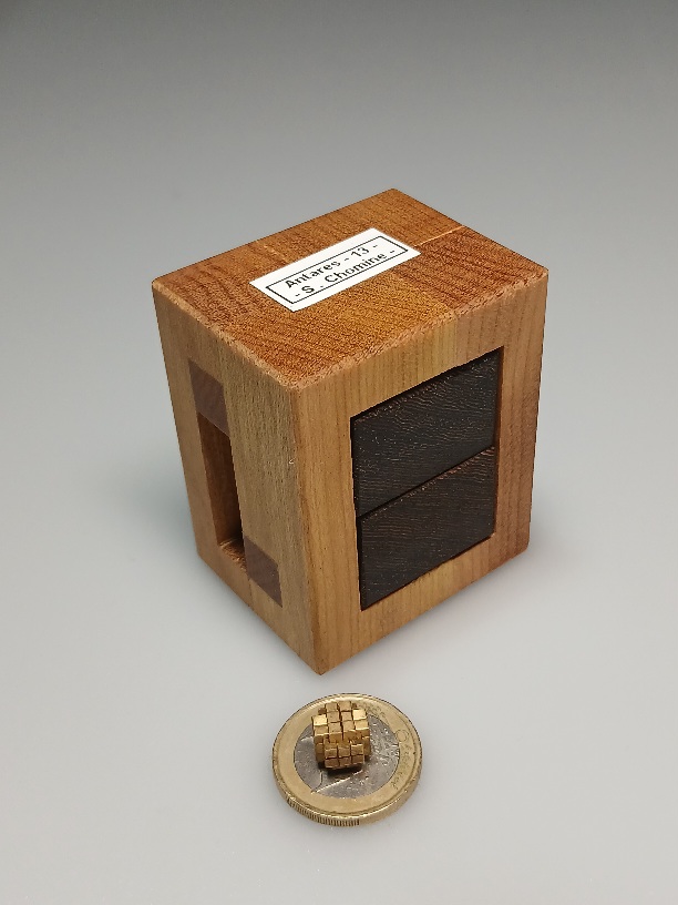 CM- 65 est un puzzle du créateur Stéphane Chomine très apprécié des collectionneurs du monde entier Il est composé de 10 pièces contenues dans une cage ajourée très complexe à fabriquer Solution unique de niveau 27-23 avec un total de 65 mouvements (voir copie écran Burtools joint)Pour celui ci la cage est en Pau Amarello Les 10 pièces mobiles sont en Amarante Fabrication de moi même (Maurice Vigouroux) les 8 exemplaires produits seront mis en vente progressivement Celui ci est l...