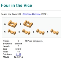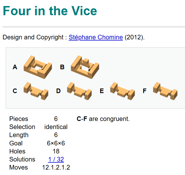 CM- 61 est un puzzle du créateur Stéphane Chomine très apprécié des collectionneurs du monde entier Il est composé de 10 pièces contenues dans une cage ajourée très complexe à fabriquer Solution unique de niveau 43 avec un total de 61 mouvements (voir copie écran Burtools joint)Pour celui ci la cage est en Noyer ainsi que les 4 pièces longues les 6 autres sont en Amarante Fabrication de moi même (Maurice Vigouroux) les 4 seuls exemplaires produits seront mis en vente progressivem...