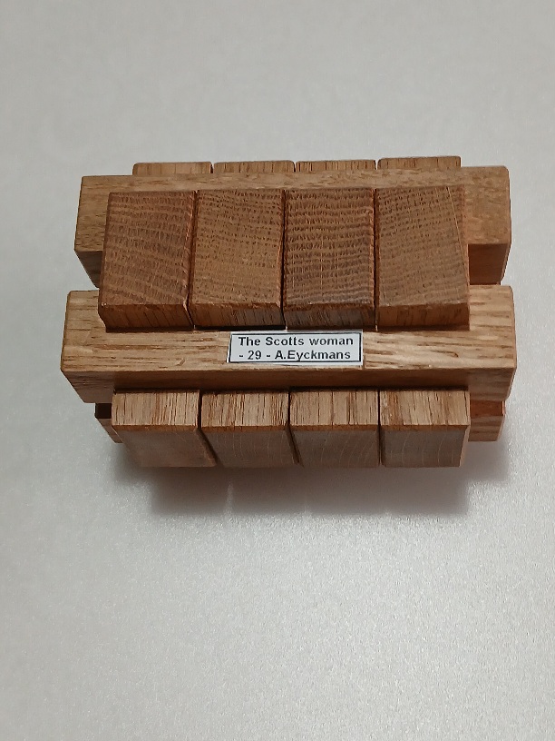 CM- 61 est un puzzle du créateur Stéphane Chomine très apprécié des collectionneurs du monde entier Il est composé de 10 pièces contenues dans une cage ajourée très complexe à fabriquer Solution unique de niveau 43 avec un total de 61 mouvements (voir copie écran Burtools joint)Pour celui ci la cage est en Noyer ainsi que les 4 pièces longues les 6 autres sont en Amarante Fabrication de moi même (Maurice Vigouroux) les 4 seuls exemplaires produits seront mis en vente progressivem...
