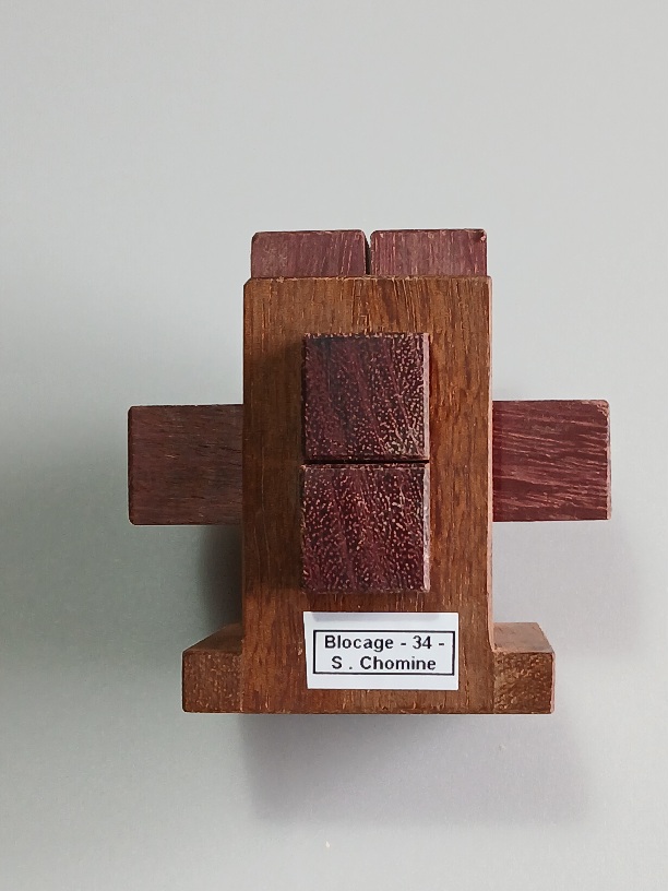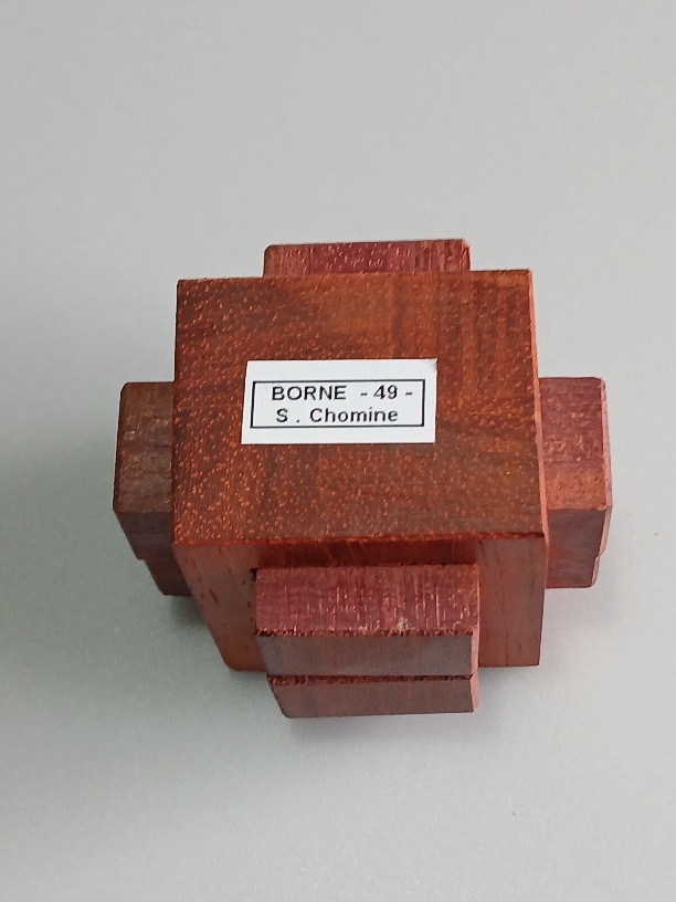 CM- 65 est un puzzle du créateur Stéphane Chomine très apprécié des collectionneurs du monde entier Il est composé de 10 pièces contenues dans une cage ajourée très complexe à fabriquer Solution unique de niveau 27-23 avec un total de 65 mouvements (voir copie écran Burtools joint)Pour celui ci la cage est en Pau Amarello Les 10 pièces mobiles sont en Amarante Fabrication de moi même (Maurice Vigouroux) les 8 exemplaires produits seront mis en vente progressivement Celui ci est l...